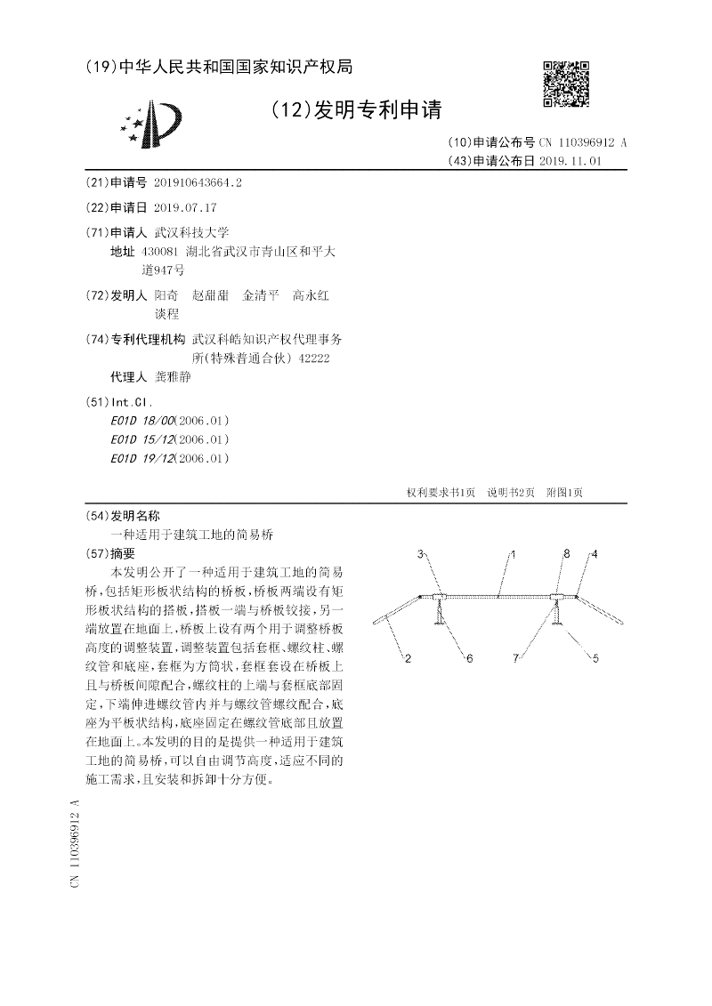本发明公开了一种适用于建筑工地的简易桥,包括矩形板状结构的桥板,桥板两端设有矩形板状结构的搭板,搭板一端与桥板铰接,另一端放置在地面上,桥板上设有两个用于调整桥板高度的调整装置,调整装置包括套框、螺纹柱、螺纹管和底座,套框为方筒状,套框套设在桥板上且与桥板间隙配合,螺纹柱的上端与套框底部固定,下端伸进螺纹管内并与螺纹管螺纹配合,底座为平板状结构,底座固定在螺纹管底部且放置在地面上。本发明的目的是提供一种适用于建筑工地的简易桥,可以自由调节高度,适应不同的施工需求,且安装和拆卸十分方便。