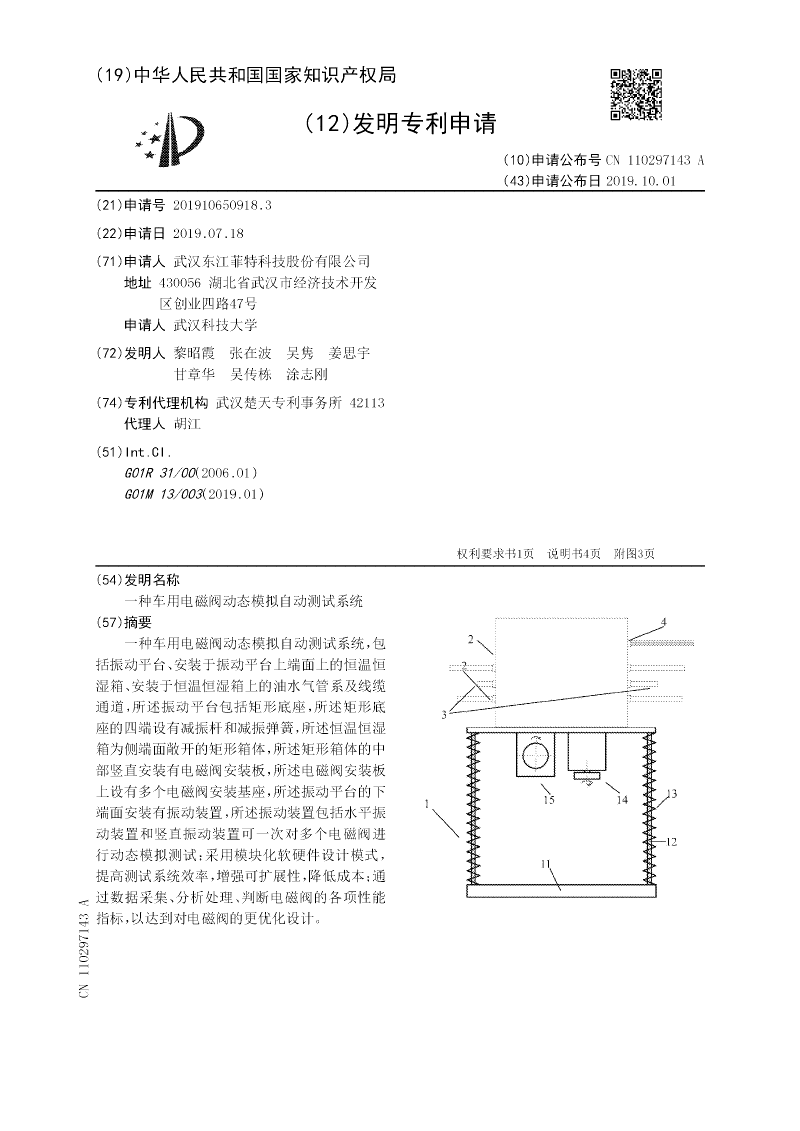 一种车用电磁阀动态模拟自动测试系统,包括振动平台、安装于振动平台上端面上的恒温恒湿箱、安装于恒温恒湿箱上的油水气管系及线缆通道,所述振动平台包括矩形底座,所述矩形底座的四端设有减振杆和减振弹簧,所述恒温恒湿箱为侧端面敞开的矩形箱体,所述矩形箱体的中部竖直安装有电磁阀安装板,所述电磁阀安装板上设有多个电磁阀安装基座,所述振动平台的下端面安装有振动装置,所述振动装置包括水平振动装置和竖直振动装置可一次对多个电磁阀进行动态模拟测试;采用模块化软硬件设计模式,提高测试系统效率,增强可扩展性,降低成本;通过数据采集、分析处理、判断电磁阀的各项性能指标,以达到对电磁阀的更优化设计。