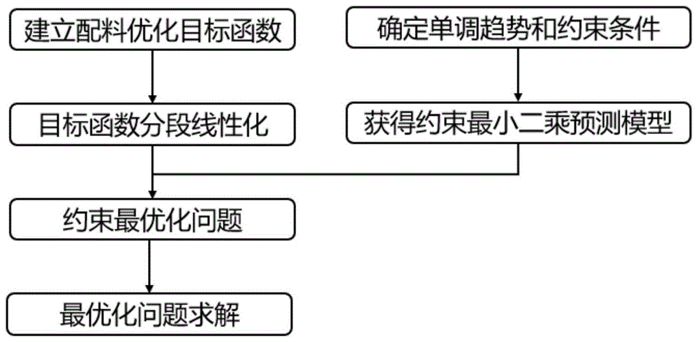 本发明公开了一种基于先验知识的铁合金生产配料优化方法,包括如下步骤:S1、根据冶炼吨铁配料成本、原燃料用量和电耗之间关系,以冶炼成本作为优化目标,建立配料优化目标函数;S2、按照原料中锰品位变化对目标函数进行分段线性化近似线性处理,得到分段线性目标函数;S3、在分段线性化每个分段区间内,采用带先验知识的限定单调趋势约束的最小二乘法求解焦比与电耗预测模型;S4、以限制性条件作为约束,采用单纯形法对每段分段线性目标函数求解,得到各段区间内铁合金原料最优配比,综合所有区间配比获得满足约束条件下的全局最优原料配比。本发明方法有助于降低铁合金生产成本,提升铁合金品质。