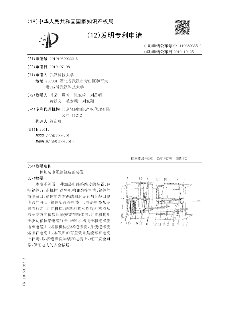 本发明涉及一种加装电缆绝缘皮的装置,包括箱体、行走机构、送料机构和熔接机构,箱体的前侧敞口,箱体的左右两端相对设有与其敞口侧连通的开口;箱体架设在电缆上,并沿电缆从左向右行走,行走机构、送料机构和熔接机构沿从右至左方向依次间隔安装在箱体内,行走机构用于驱动箱体沿电缆行走,送料机构用于将绝缘皮送至电缆上,熔接机构热熔绝缘皮,并使绝缘皮熔接在电缆上。本发明的有益效果是能够在电缆上行走,以将绝缘皮加装在电缆上,施工安全可靠,保证电力的安全输送。