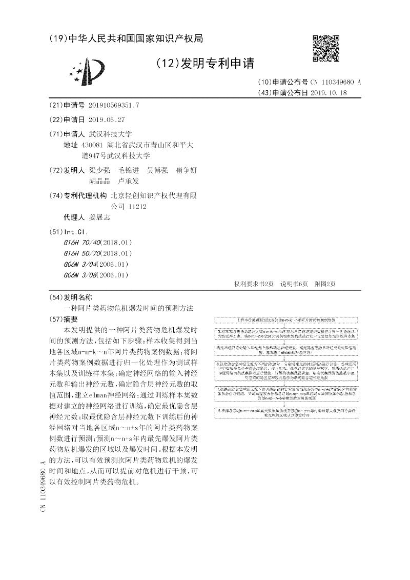 本发明提供的一种阿片类药物危机爆发时间的预测方法,包括如下步骤:样本收集得到当地各区域n‑m‑k~n年阿片类药物案例数据;将阿片类药物案例数据进行归一化处理作为测试样本集以及训练样本集;确定神经网络的输入神经元数和输出神经元数,确定隐含层神经元数的取值范围,建立elman神经网络;通过训练样本集数据对建立的神经网络进行训练,确定最优隐含层神经元数;取最优隐含层神经元数下训练后的神经网络对当地各区域n~n+s年的阿片类药物案例数进行预测;预测n~n+s年内最先爆发阿片类药物危机爆发的区域以及爆发时间。根据本发明的方法,可以有效预测次阿片类药物危机的爆发时间和地点,从而可以提前对危机进行干预,可以有效控制阿片类药物危机。