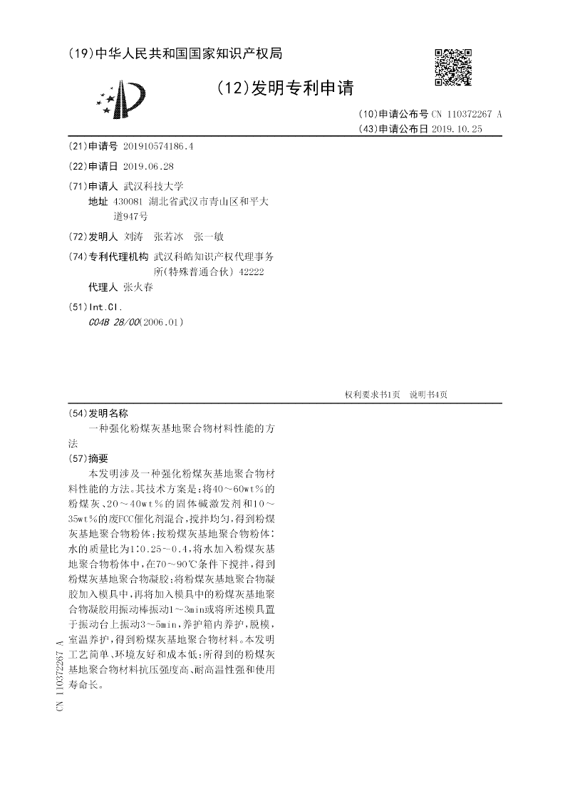 本发明涉及一种强化粉煤灰基地聚合物材料性能的方法。其技术方案是:将40~60wt%的粉煤灰、20~40wt%的固体碱激发剂和10~35wt%的废FCC催化剂混合,搅拌均匀,得到粉煤灰基地聚合物粉体;按粉煤灰基地聚合物粉体∶水的质量比为1∶0.25~0.4,将水加入粉煤灰基地聚合物粉体中,在70~90℃条件下搅拌,得到粉煤灰基地聚合物凝胶;将粉煤灰基地聚合物凝胶加入模具中,再将加入模具中的粉煤灰基地聚合物凝胶用振动棒振动1~3min或将所述模具置于振动台上振动3~5min,养护箱内养护,脱模,室温养护,得到粉煤灰基地聚合物材料。本发明工艺简单、环境友好和成本低;所得到的粉煤灰基地聚合物材料抗压强度高、耐高温性强和使用寿命长。
