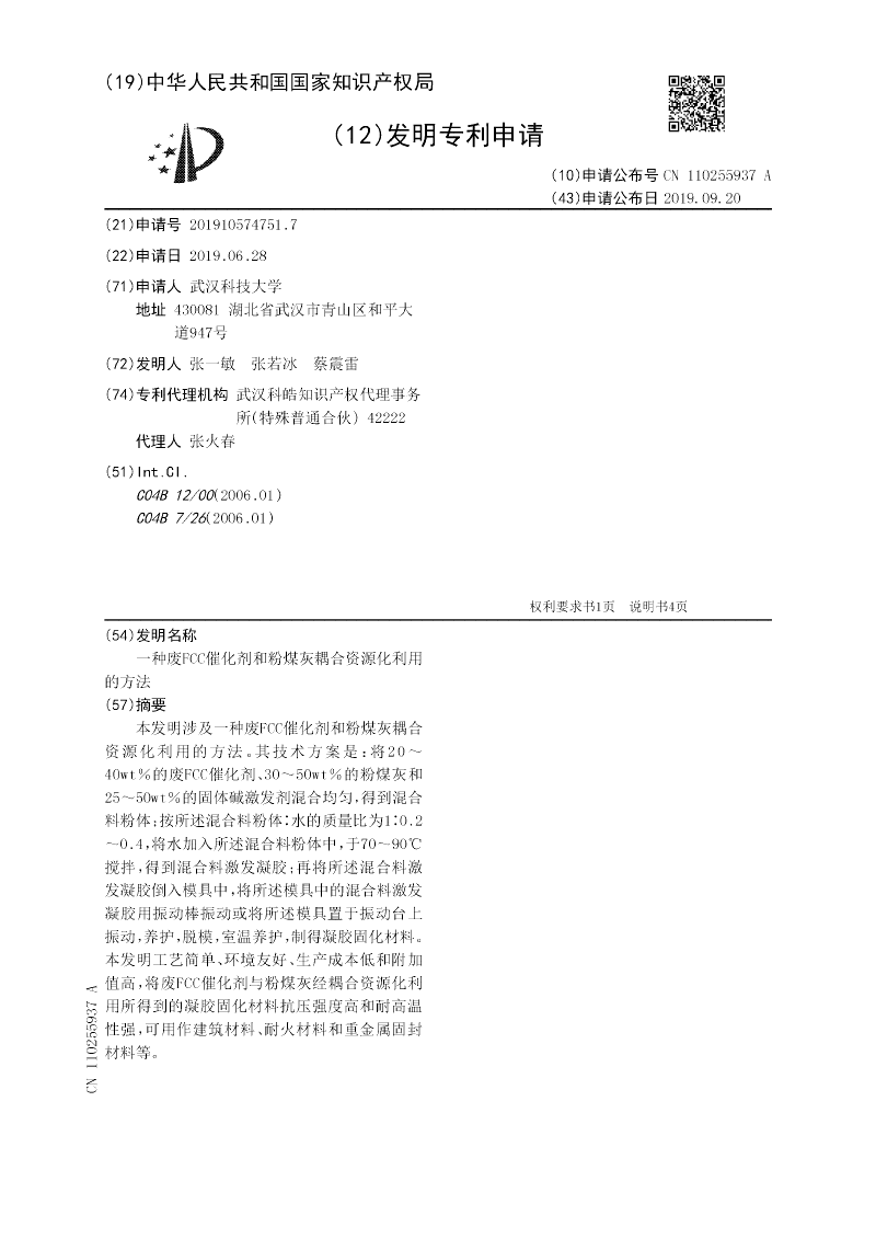 一种废FCC催化剂和粉煤灰耦合资源化利用的方法