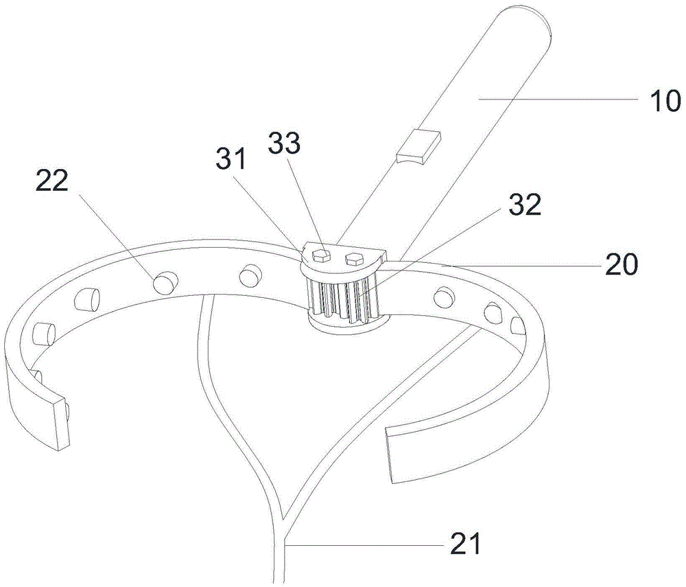 本实用新型涉及一种石灰水喷射装置,包括手持杆、两个扇环形悬臂和紧锁件,两个悬臂的弧形开口相互靠近,两个悬臂的一端均可旋转的设置在手持杆的一端,两个悬臂可在其形成的平面内旋转相互靠近或远离,并通过锁紧件与手持杆固定住,悬臂内部中空,其上设有连通其内部空腔的进料口,该进料口通过进料管与高压石灰水容器连通,悬臂内壁上均布有多个连通其内部空腔的喷射口。本实用新型石灰水喷射装置结构简单,使用方便,节省了树木喷涂石灰水过程中的时间,降低了劳动强度,并且该装置使用过程中非常灵活,可以适用于不同区域不同地形的树木的石灰水喷涂工作。