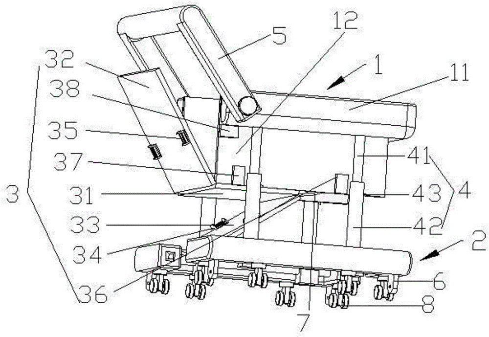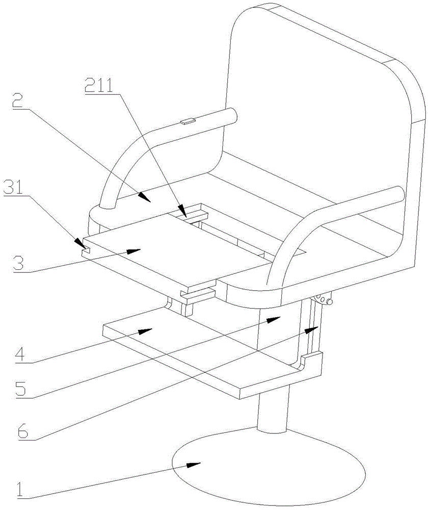 本实用新型公开了一种可升降的老人椅,包括底座、支撑板、座板和脚踏板,所述支撑板通过升降装置沿前后方向水平安装在所述底座上,且所述支撑板位于所述底座上方,所述脚踏板通过安装机构沿左右方向水平安装在所述支撑板下方,并位于升降装置的前方,所述支撑板前端向后凹设有上下贯穿其的安装槽,所述座板可拆卸的安装在所述安装槽处,所述升降装置可驱动所述支撑板带动其上的所述脚踏板同步升降。本申请所述可升降老人椅在保证老人安全的前提下,站在所述脚踏板上的老人可上升以取高处的用品,增加了本申请所述老人椅的用途。