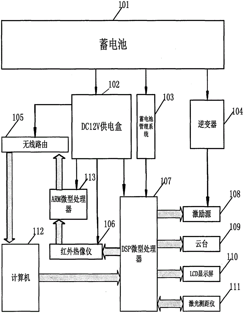 本实用新型涉及一种基于DSP的红外热成像缺陷无损检测装置,其特征在于,所述装置包括:蓄电池(101)、DC12V供电盒(102)、蓄电池管理系统(103)、逆变器(104)、无线路由(105)、红外热像仪(106)、DSP微型处理器(107)、激励源(108)、云台(109)、LCD显示屏(110)、激光测距仪(111)、计算机(112)、ARM微型处理器(113)。该装置满足了对复合型材料缺陷检测要求,实现了对复合型材料的非接触式检测,检测速度快、结果准确,极大地提高了检测效率。本实用新型所提供的无损检测装置,可广泛用于红外无损检测领域,具有广阔的应用前景。