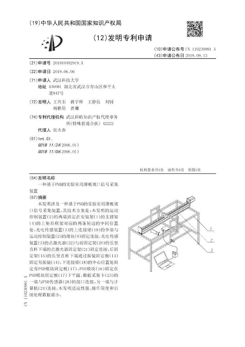 本实用新型涉及一种用于实验室的基于PSD的薄板坡口信号采集装置。其技术方案是:本装置的运动控制装置的两端固定在安装架的支撑架的上矩形框架对应的两条短边的中间位置处,光电传感装置的上连接梁的中部与运动控制装置的滑块固定连接。光电传感装置的点激光器与前固定架的长竖直杆下端的点激光器固定架固定连接,后固定架的长竖直杆下端通过振镜固定板固定有振镜,下连接梁的中心位置处固定有PSD模块固定板,PSD模块固定在PSD模块固定板下平面。数据采集卡的一端与PSD传感器的接口连接,另一端与计算机连接。本装置适应性强、操作简便和后续处理数据量小。