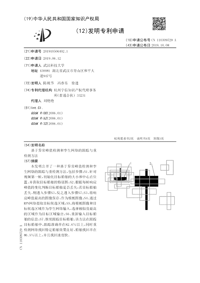 本发明公开了一种基于异常峰值检测和孪生网络的跟踪与重检测方法,包括步骤:S1、针对视频第一帧,初始化目标船舶的大小和中心点位置,并获取目标船舶的特征图;S2、根据每帧响应峰值的变化判断目标船舶是否丢失:若目标船舶丢失,则进入步骤S3,反之进入步骤S7;S3、将响应峰值最高的图像保存,作为模板图像;S4、通过RPN网络提取目标候选区域;S5、将模板图像和目标候选区域作为孪生网络输入,选择相似度最高的区域作为目标区域输出;S6、重新输入目标船舶的信息;S7、继续跟踪目标船舶。该方法在跟踪目标船舶中,跟踪准确率在82.6%以上,同时重检测网络找回特定船舶效果良好,船舶找回率在86.5%以上,并且找回速度快。