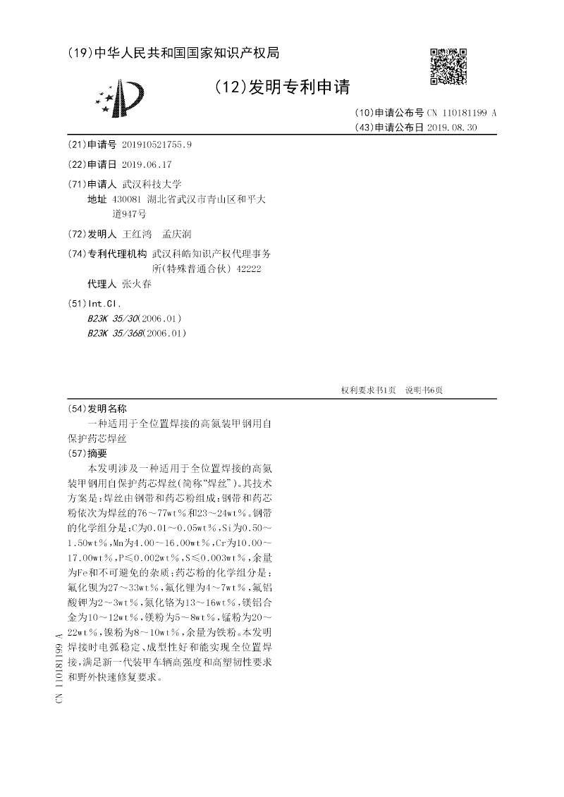 本发明涉及一种适用于全位置焊接的高氮装甲钢用自保护药芯焊丝(简称“焊丝”)。其技术方案是:焊丝由钢带和药芯粉组成:钢带和药芯粉依次为焊丝的76~77wt%和23~24wt%。钢带的化学组分是:C为0.01~0.05wt%,Si为0.50~1.50wt%,Mn为4.00~16.00wt%,Cr为10.00~17.00wt%,P≤0.002wt%,S≤0.003wt%,余量为Fe和不可避免的杂质;药芯粉的化学组分是:氟化钡为27~33wt%,氟化锂为4~7wt%,氟铝酸钾为2~3wt%,氮化铬为13~16wt%,镁铝合金为10~12wt%,镁粉为5~8wt%,锰粉为20~22wt%,镍粉为8~10wt%,余量为铁粉。本发明焊接时电弧稳定、成型性好和能实现全位置焊接,满足新一代装甲车辆高强度和高塑韧性要求和野外快速修复要求。