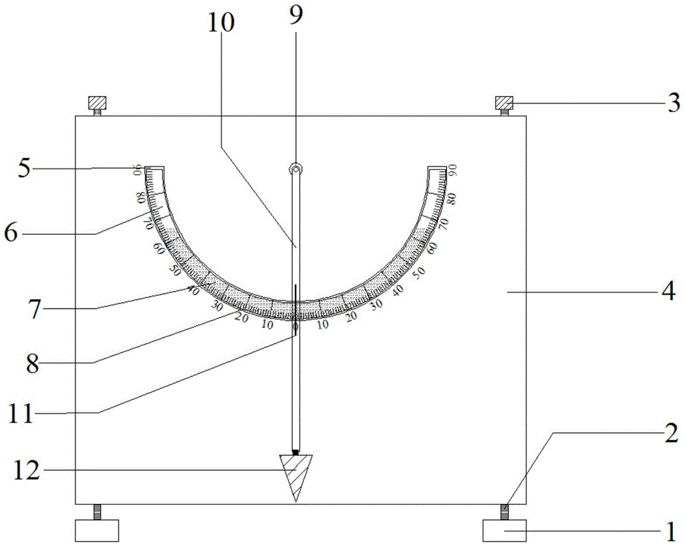 本实用新型公开了一种道路桥梁垂直检测装置,包括底座,所述底座上端连接有调节螺栓,所述调节螺栓上端连接有调节旋钮,所述底座上端设置有支撑盒,所述支撑盒正面设置有第一固定槽,所述第一固定槽正面设置有第一水平计,所述第一水平计上端设置有固定轴,所述固定轴连接有指针,所述指针中央设置有红线,所述指针下端连接有铅垂,所述支撑盒右端设置有第二固定槽,所述第二固定槽右端设置有第二水平计,本实用新型结构简单,在道路或者桥梁施工过程中,本装置利用重力可以测量公路或者桥梁是否垂直,时刻检测施工中垂直度上可能存在的问题,有效避免因垂直度问题而产生的返工现象。