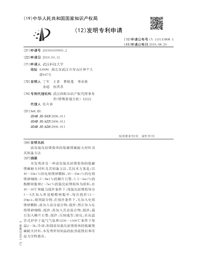 本发明涉及一种添加氮化硅镁粉体的低碳镁碳耐火材料及其制备方法。其技术方案是:以40~55wt%的电熔镁砂颗粒、30~45wt%的电熔镁砂细粉、5~8wt%的鳞片石墨、3.5~6wt%的酚醛树脂和2~7wt%的氮化硅镁粉体为原料;在40~50℃和磁力搅拌条件下,将氮化硅镁粉体分3~5次加入所述酚醛树脂中,每次搅拌15~20min,得到混合物。在搅拌条件下,先加入电熔镁砂颗粒,再加入部分混合物,搅拌;然后加入电熔镁砂细粉,搅拌,再加入其余混合物,搅拌;最后加入鳞片石墨,搅拌,压制成型,固化,在高温管式炉中于氩气气氛和1200~1500℃条件下保温2~3h,冷却,制得添加氮化硅镁粉体的低碳镁碳耐火材料。本发明所制制品的抗热震性好和常温力学性能高。
