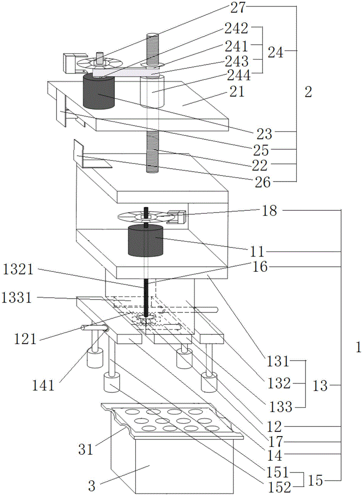 本实用新型涉及自动抓取技术领域,具体是涉及一种自动抓取装置,抓取组件,抓取组件包括抓取电机、传动轴、安装架、齿轮、两滑块、至少两个抓指和两活动轴,抓取电机固定于安装架上,传动轴受抓取电机驱动旋转,传动轴的另一端固定有齿轮,两活动轴平行设置,且可在安装架上滑动,活动轴的一端固定于一个滑块上,另一端与另一个滑块滑动连接,活动轴的中间段开设有齿槽,两传动轴上的齿槽相对设置,齿轮的两侧分别与两传动轴上的齿槽啮合,抓指两两相对设置,且抓指与滑块固定相连。本实用新型通过抓取电机带动两滑块相对远离或靠近,以带动抓指夹持或松开样本盒,再通过升降组件带动抓取组件上下横移,以实现自动抓取样本盒,提高了工作效率。