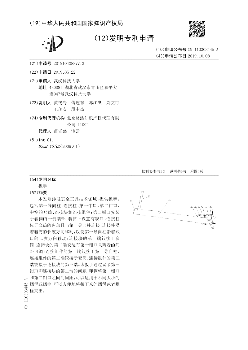 本发明涉及五金工具技术领域,提供扳手,包括第一导向柱、连接柱、第一钳口、第二钳口、中空的套筒、连接块和连接组件;第二钳口安装于套筒的一侧端部;套筒上设置有缺口,连接柱位于套筒的内部且与第一导向柱连接,连接柱沿着套筒的长度方向移动,以使第一导向柱沿着缺口的长度方向移动;连接块的第一端铰接于套筒,连接块的第二端安装有第一钳口且两者的间距可调;连接组件的第一端铰接于第一导向柱,连接组件的第二端铰接于套筒,连接组件的第三端铰接于连接块的第三端。该扳手通过调节第一钳口和连接块的第二端的间距,即调整第一钳口和第二钳口之间的间距,可以适用于不同大小的螺母或螺栓,可以方便地将扭下来的螺母或者螺栓夹出。