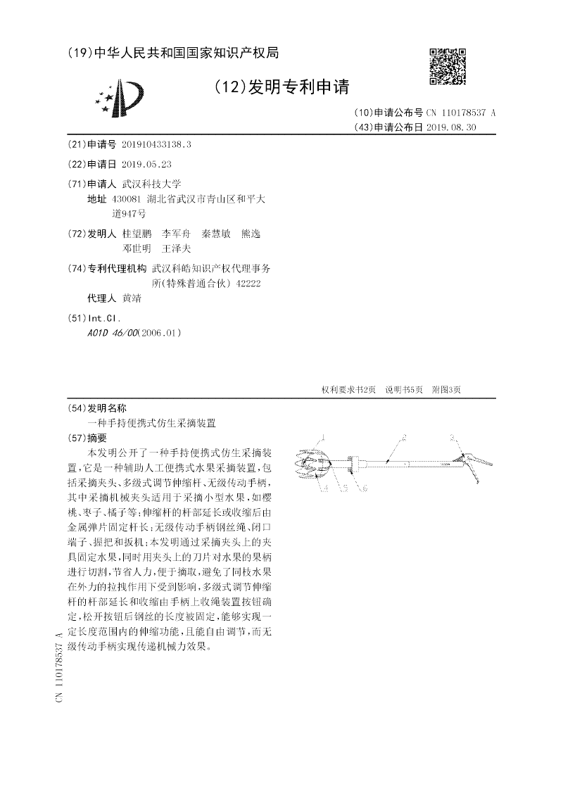 本发明公开了一种手持便携式仿生采摘装置,它是一种辅助人工便携式水果采摘装置,包括采摘夹头、多级式调节伸缩杆、无级传动手柄,其中采摘机械夹头适用于采摘小型水果,如樱桃、枣子、橘子等;伸缩杆的杆部延长或收缩后由金属弹片固定杆长;无级传动手柄钢丝绳、闭口端子、握把和扳机;本发明通过采摘夹头上的夹具固定水果,同时用夹头上的刀片对水果的果柄进行切割,节省人力,便于摘取,避免了同枝水果在外力的拉拽作用下受到影响,多级式调节伸缩杆的杆部延长和收缩由手柄上收绳装置按钮确定,松开按钮后钢丝的长度被固定,能够实现一定长度范围内的伸缩功能,且能自由调节,而无级传动手柄实现传递机械力效果。