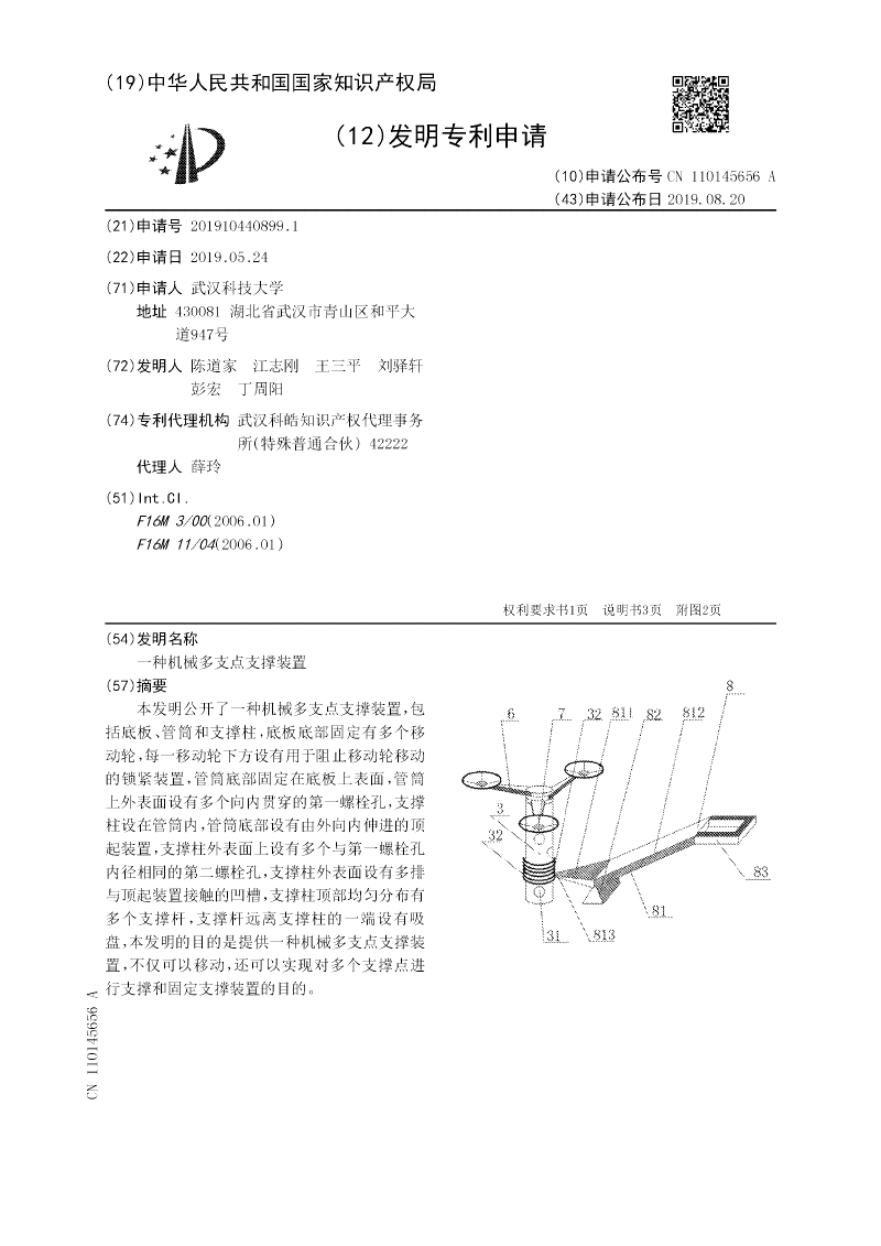 本发明公开了一种机械多支点支撑装置,包括底板、管筒和支撑柱,底板底部固定有多个移动轮,每一移动轮下方设有用于阻止移动轮移动的锁紧装置,管筒底部固定在底板上表面,管筒上外表面设有多个向内贯穿的第一螺栓孔,支撑柱设在管筒内,管筒底部设有由外向内伸进的顶起装置,支撑柱外表面上设有多个与第一螺栓孔内径相同的第二螺栓孔,支撑柱外表面设有多排与顶起装置接触的凹槽,支撑柱顶部均匀分布有多个支撑杆,支撑杆远离支撑柱的一端设有吸盘,本发明的目的是提供一种机械多支点支撑装置,不仅可以移动,还可以实现对多个支撑点进行支撑和固定支撑装置的目的。