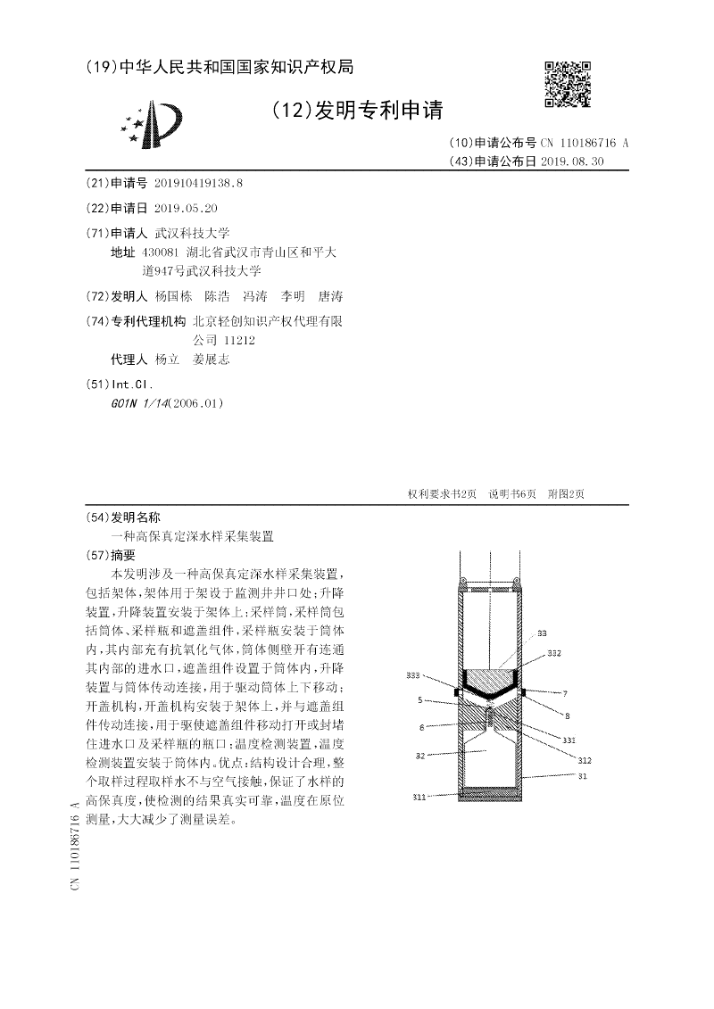本发明涉及一种高保真定深水样采集装置,包括架体,架体用于架设于监测井井口处;升降装置,升降装置安装于架体上;采样筒,采样筒包括筒体、采样瓶和遮盖组件,采样瓶安装于筒体内,其内部充有抗氧化气体,筒体侧壁开有连通其内部的进水口,遮盖组件设置于筒体内,升降装置与筒体传动连接,用于驱动筒体上下移动;开盖机构,开盖机构安装于架体上,并与遮盖组件传动连接,用于驱使遮盖组件移动打开或封堵住进水口及采样瓶的瓶口;温度检测装置,温度检测装置安装于筒体内。优点:结构设计合理,整个取样过程取样水不与空气接触,保证了水样的高保真度,使检测的结果真实可靠,温度在原位测量,大大减少了测量误差。