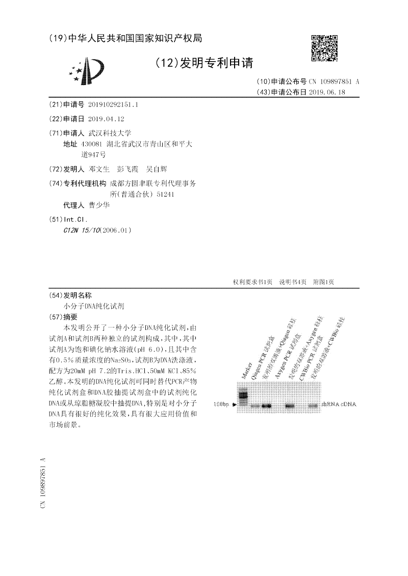 ,试剂B为DNA洗涤液,配方为20mM pH 7.2的Tris.HCl、50mM KCl、85%乙醇。本发明的DNA纯化试剂可同时替代PCR产物纯化试剂盒和DNA胶抽提试剂盒中的试剂纯化DNA或从琼脂糖凝胶中抽提DNA,特别是对小分子DNA具有很好的纯化效果,具有很大应用价值和市场前景。