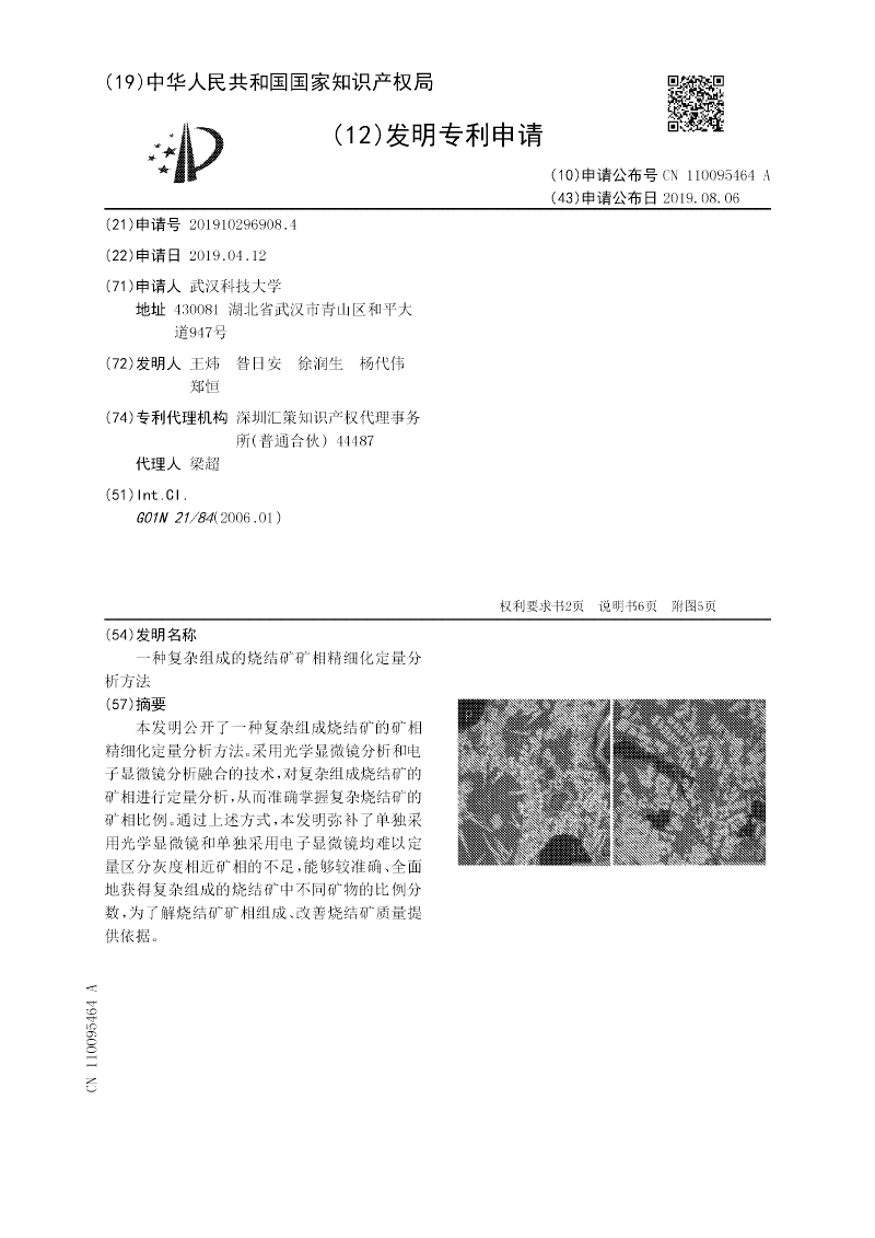本发明公开了一种复杂组成烧结矿的矿相精细化定量分析方法。采用光学显微镜分析和电子显微镜分析融合的技术,对复杂组成烧结矿的矿相进行定量分析,从而准确掌握复杂烧结矿的矿相比例。通过上述方式,本发明弥补了单独采用光学显微镜和单独采用电子显微镜均难以定量区分灰度相近矿相的不足,能够较准确、全面地获得复杂组成的烧结矿中不同矿物的比例分数,为了解烧结矿矿相组成、改善烧结矿质量提供依据。