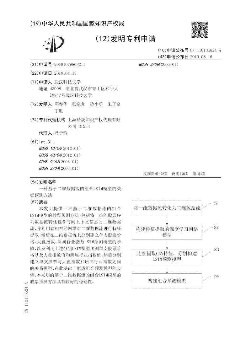 本发明提供一种基于二维数据流的组合LSTM模型的股票预测方法,包括将一维的股票序列数据流转化包含时间上下文信息的二维数据流,并利用卷积神经网络对二维数据流进行特征提取,然后在二维数据流上分别建立单支股票价格、大盘指数、所属行业指数LSTM预测模型的步骤,以及利用上述分别LSTM模型预测单支股票价格以及大盘指数值和所属行业指数值,然后分别建立单支股票与大盘指数和所属行业指数之间的关系模型,在此基础上形成组合预测模型的步骤。本发明的基于二维数据流的组合LSTM模型的股票预测方法具有较好的稳健性。