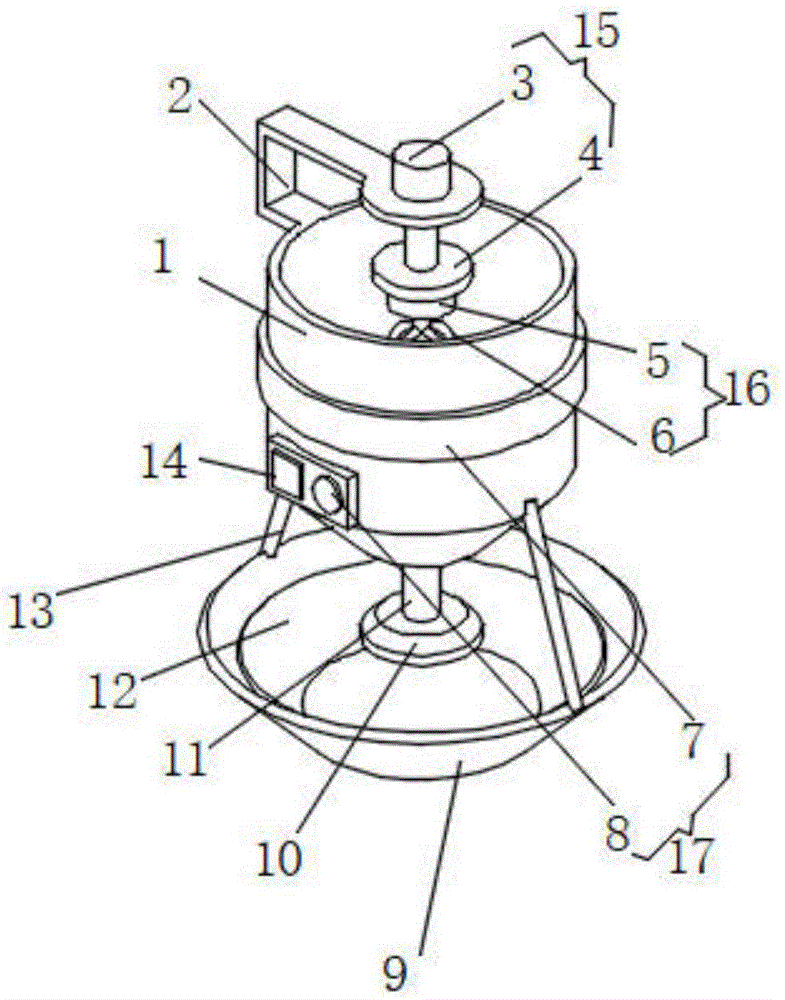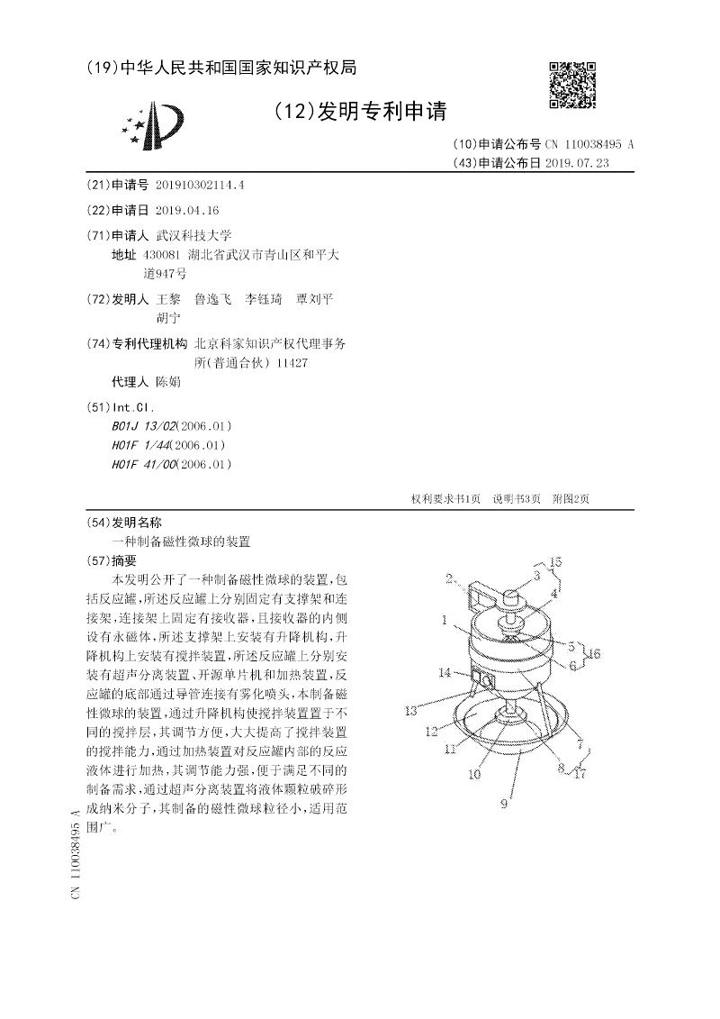 本实用新型公开了一种制备磁性微球的装置,包括反应罐,所述反应罐上分别固定有支撑架和连接架,连接架上固定有接收器,且接收器的内侧设有永磁体,所述支撑架上安装有升降机构,升降机构上安装有搅拌装置,所述反应罐上分别安装有超声分离装置、开源单片机和加热装置,反应罐的底部通过导管连接有雾化喷头,本制备磁性微球的装置,通过升降机构使搅拌装置置于不同的搅拌层,其调节方便,大大提高了搅拌装置的搅拌能力,通过加热装置对反应罐内部的反应液体进行加热,其调节能力强,便于满足不同的制备需求,通过超声分离装置将液体颗粒破碎形成纳米分子,其制备的磁性微球粒径小,适用范围广。