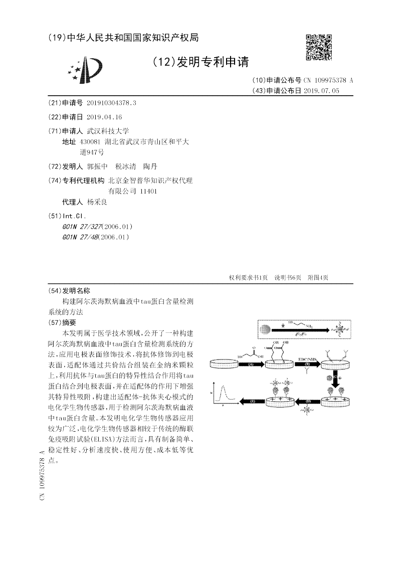 本发明属于医学技术领域,公开了一种构建阿尔茨海默病血液中tau蛋白含量检测系统的方法,应用电极表面修饰技术,将抗体修饰到电极表面,适配体通过共价结合组装在金纳米颗粒上,利用抗体与tau蛋白的特异性结合作用将tau蛋白结合到电极表面,并在适配体的作用下增强其特异性吸附,构建出适配体‑抗体夹心模式的电化学生物传感器,用于检测阿尔茨海默病血液中tau蛋白含量。本发明电化学生物传感器应用较为广泛,电化学生物传感器相较于传统的酶联免疫吸附试验(ELISA)方法而言,具有制备简单、稳定性好、分析速度快、使用方便、成本低等优点。