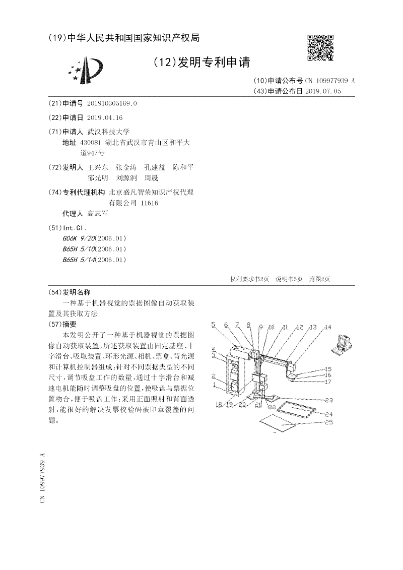 本实用新型公开了一种基于机器视觉的票据图像自动获取设备,所述获取设备由固定基座、十字滑台、吸取设备、环形光源、相机、票盒、背光源和计算机控制器组成;针对不同票据类型的不同尺寸,调节吸盘工作的数量,通过十字滑台和减速电机能随时调整吸盘的位置,使吸盘与票据位置吻合,便于吸盘工作;采用正面照射和背面透射,能很好的解决发票校验码被印章覆盖的问题。