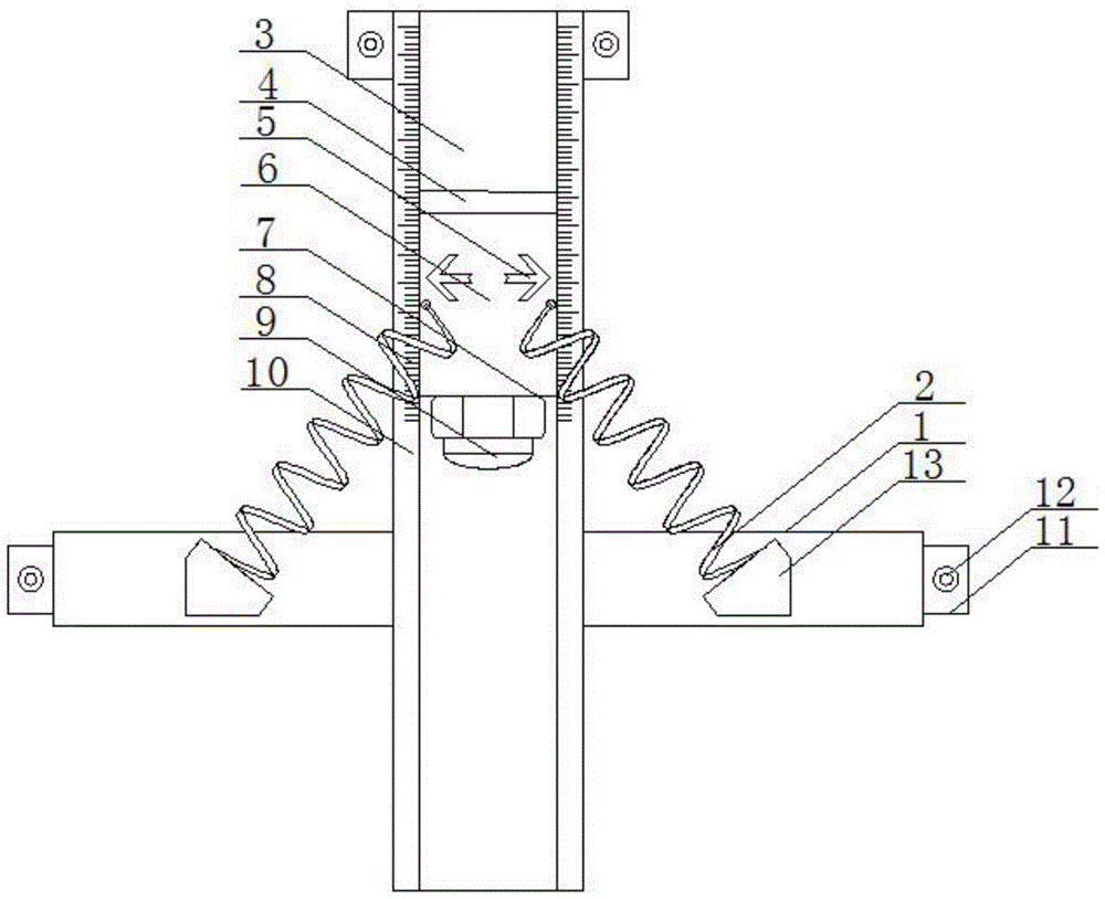 本实用新型公开了一种用于测试结构动力学参数的十字力锤发射器,包括底板,所述底板的上端设有凹槽,所述凹槽内放置有锤体,所述锤体的一端固定有配重块,所述锤体的另一端固定有力传感器,所述力传感器的一端固定有锤头,所述底板的两侧均固定有安装板,两个安装板的一端侧壁上均固定有安装块,两个安装块的一端侧壁上均固定有弹簧,两个弹簧的一端分别固定在锤体的两端。本实用新型不仅解决了在测量过程中,很容易出现误差的问题,还解决了不方便安装和拆卸的问题,量化了锤击速度,保证了每次敲击都有相同的效果,尽可能地减少了由测试工程师手动操作经验带来的实验误差,提高了测量的精准性,操作简单,使用方便。