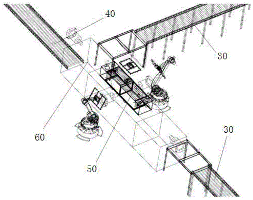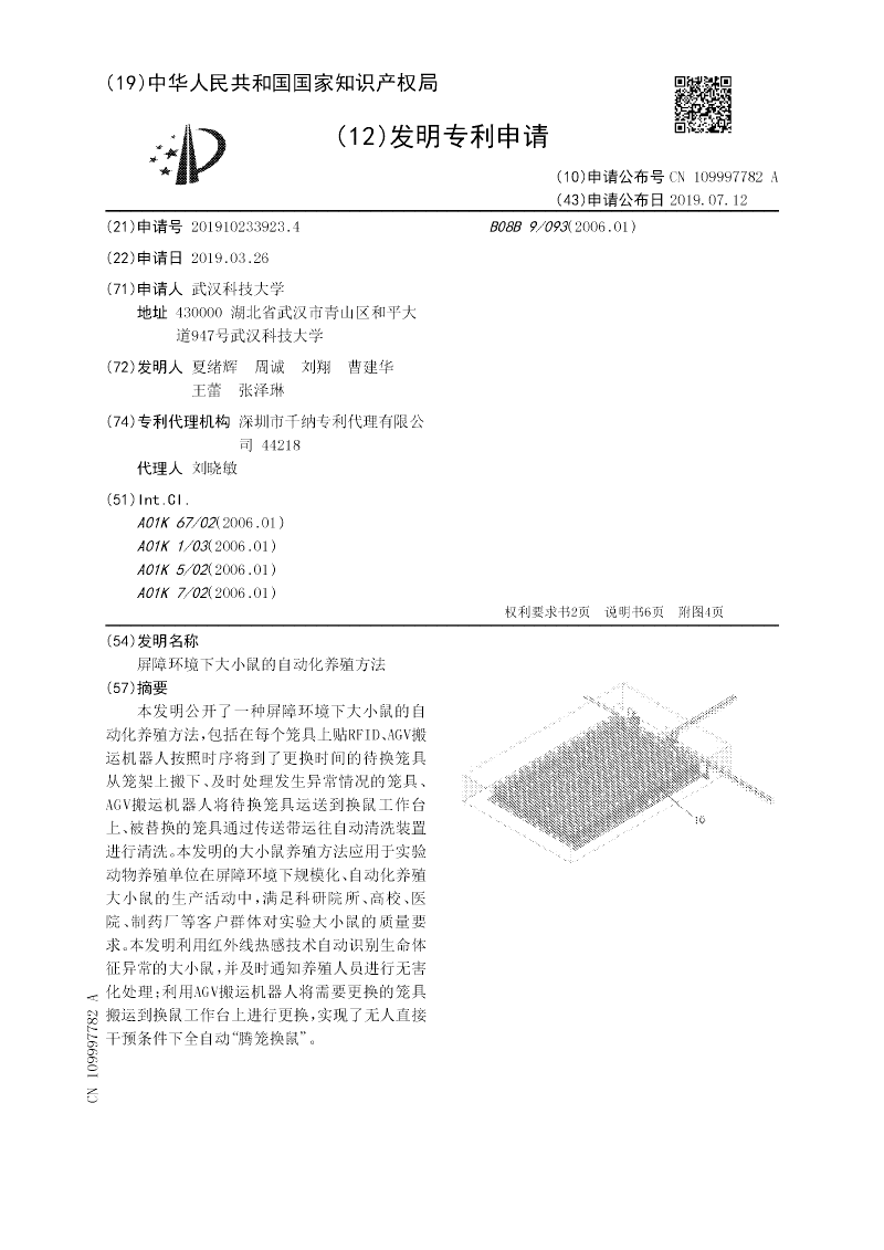 本实用新型公开了一种屏障环境下大小鼠养殖的自动化生产线,包括在每个笼具上贴RFID、AGV搬运机器人按照时序将到了更换时间的旧笼具从货架上搬下、及时处理发生异常情况的笼具、AGV搬运机器人将笼具运送到换鼠工作台上、旧笼具通过传送带运往自动清洗装置进行清洗。本实用新型可应用于实验动物养殖单位在屏障环境下规模化、自动化养殖大小鼠的生产活动中,满足科研院所、高校、医院、制药厂等客户群体对实验大小鼠的质量要求。本实用新型利用红外线热感技术自动识别出生命体征的大小鼠,并及时通知养殖人员进行无害化处理,可进行自动化更换的大小鼠养殖笼具,利用AGV搬运机器人将需要更换的笼具搬运到换鼠工作台上进行更换。