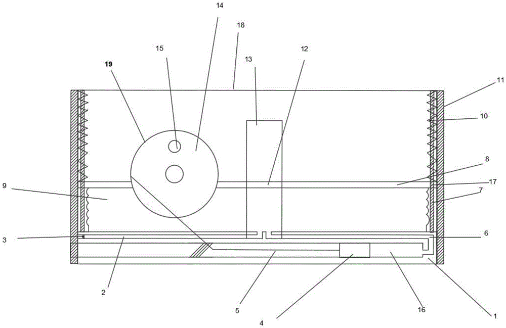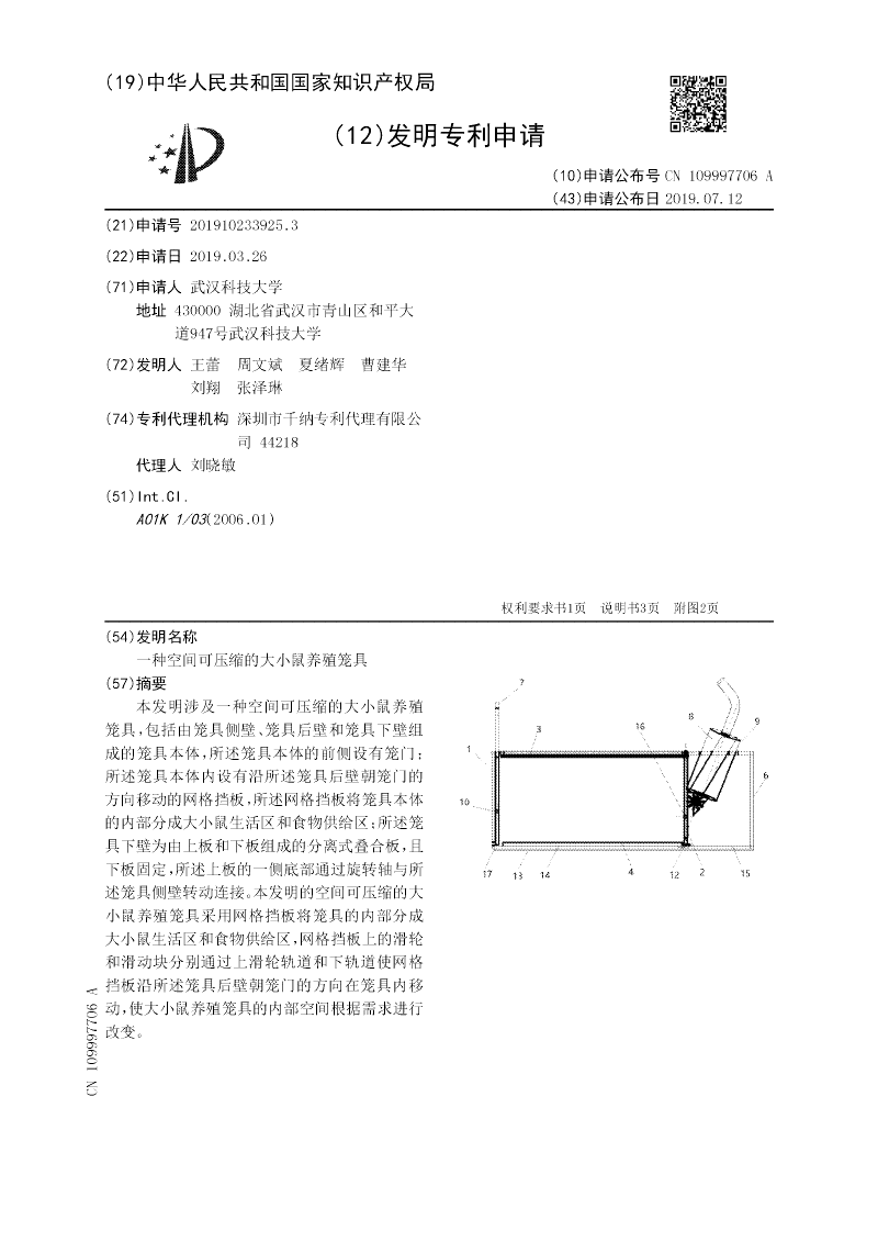 本实用新型涉及一种空间可压缩的大小鼠养殖笼具,包括由笼具侧壁、笼具后壁和笼具下壁组成的笼具本体,所述笼具本体的前侧设有笼门;所述笼具本体内设有沿所述笼具后壁朝笼门的方向移动的网格挡板,所述网格挡板将笼具本体的内部分成大小鼠生活区和食物供给区;所述笼具下壁为由上板和下板组成的分离式叠合板,且下板固定,所述上板的一侧底部通过旋转轴与所述笼具侧壁转动连接。本实用新型的空间可压缩的大小鼠养殖笼具采用网格挡板将笼具的内部分成大小鼠生活区和食物供给区,网格挡板上的滑轮和滑动块分别通过上滑轮轨道和下轨道使网格挡板沿所述笼具后壁朝笼门的方向在笼具内移动,使大小鼠养殖笼具的内部空间根据需求进行改变。