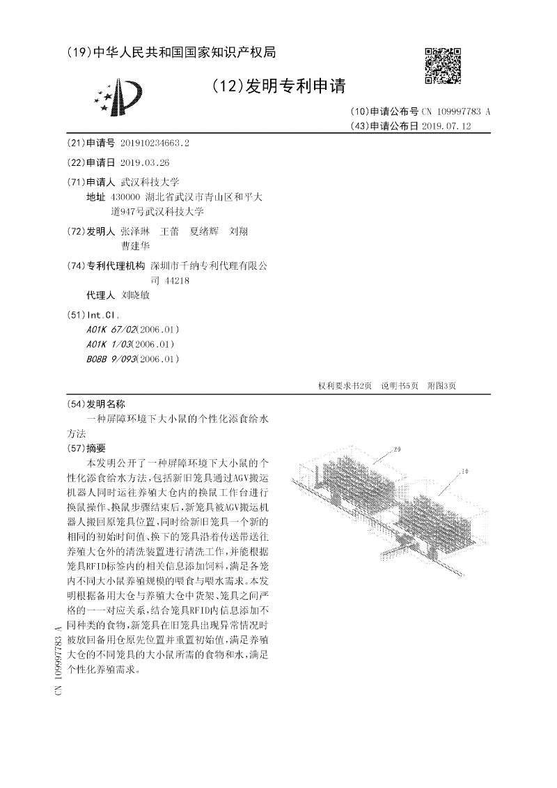 本发明公开了一种屏障环境下大小鼠的个性化添食给水方法,包括新旧笼具通过AGV搬运机器人同时运往养殖大仓内的换鼠工作台进行换鼠操作、换鼠步骤结束后,新笼具被AGV搬运机器人搬回原笼具位置,同时给新旧笼具一个新的相同的初始时间值、换下的笼具沿着传送带送往养殖大仓外的清洗装置进行清洗工作,并能根据笼具RFID标签内的相关信息添加饲料,满足各笼内不同大小鼠养殖规模的喂食与喂水需求。本发明根据备用大仓与养殖大仓中货架、笼具之间严格的一一对应关系,结合笼具RFID内信息添加不同种类的食物,新笼具在旧笼具出现异常情况时被放回备用仓原先位置并重置初始值,满足养殖大仓的不同笼具的大小鼠所需的食物和水,满足个性化养殖需求。
