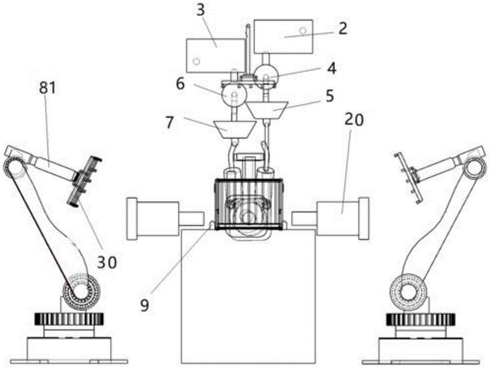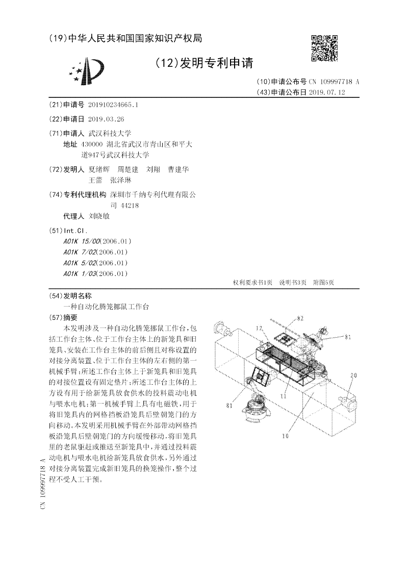本实用新型涉及一种自动化腾笼挪鼠工作台,包括工作台主体、位于工作台主体上的新笼具和旧笼具、安装在工作台主体的前后侧且对称设置的对接分离装置、位于工作台主体的左右侧的第一机械手臂;工作台主体上于新笼具和旧笼具的对接位置设有固定垫片;工作台主体的上方设有用于给新笼具放食供水的投料震动电机与喂水电机;第一机械手臂上具有电磁铁,用于将旧笼具内的网格挡板沿笼具后壁朝笼门的方向移动。本实用新型采用机械手臂在外部带动网格挡板沿笼具后壁朝笼门的方向缓慢移动,将旧笼具里的老鼠驱赶或推送至新笼具中,并通过投料震动电机与喂水电机给新笼具放食供水,另外通过对接分离装置完成新旧笼具的换笼操作,整个过程不受人工干预。