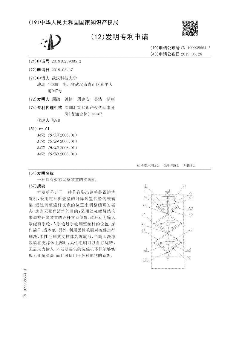 本实用新型公开了一种具有姿态调整装置的洗碗机,采用连杆折叠型的升降装置代替传统碗架,通过调整连杆支点的位置来调整碗碟的姿态,达到无死角清洗的目的;采用丝杠螺母结构来调整升降装置的连杆支点位置,丝杆动力输入端配有手轮,人手通过手轮调整丝杆的位置,操作简单,成本低;另外,利用柔性毛刷对碗碟进行刷洗,柔性毛刷其支撑体为螺旋形,当高压洗涤液喷在支撑体上部时,柔性毛刷可以自行旋转,无需动力输入;本实用新型提供的洗碗机不但能够实现无死角清洗,而且可适用于各种形状的碗碟。