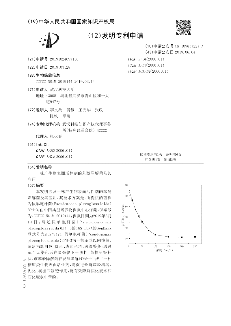 本发明涉及一株产生物表面活性剂的苯酚降解菌及其应用。其技术方案是:所提供的菌株为假单胞杆菌(Pseudomonas plecoglossicida)BPH‑3,由中国典型培养物保藏中心保藏,保藏号为:CCTCC NO:M 2019144,保藏日期为2019年3月14日,所述假单胞杆菌(Pseudomonas plecoglossicida)BPH‑3的16S rDNA的GenBank登录号为MK575471,假单胞杆菌(Pseudomonas plecoglossicida)BPH‑3为一株革兰氏阴性菌,菌落为乳白色、圆形、表面光滑,边缘整齐;通过革兰氏染色后在显微镜下呈阴性,菌株呈短杆状。该苯酚降解菌在发酵降解过程中生成了一种糖脂类生物表面活性剂,能促进长链烷烃增溶、乳化、润湿和渗透作用,能有效降解焦化废水和石化废水中苯酚。