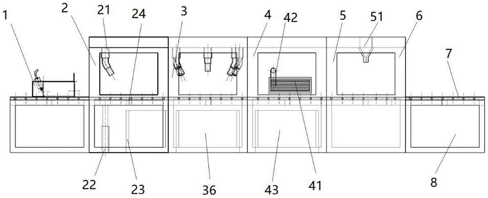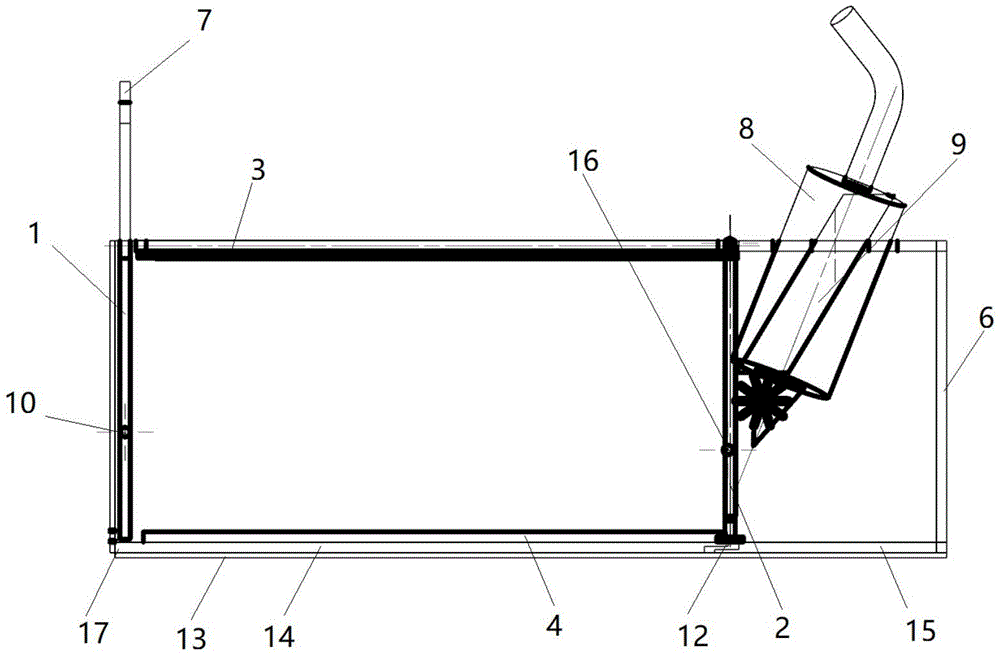 本实用新型涉及一种自动化笼具清洗机构,包括笼具,倒料室,清洗室,烘干室,放料室,外壳,传送滚筒和底座;所述倒料室,清洗室,烘干室,放料室均由外壳包围,所述外壳的正面中间部分为透明玻璃;所述传送滚筒安装在底座上,用于以缓慢的速度对笼具进行传送;所述笼具的底板由上板与下板形成的叠合式挡板组成,所述下板固定,所述上板可由旋转轴转动的连接在所述笼具的底端。本实用新型的自动化笼具清洗机构集倒料、清洗、烘干、放料为一体,实现完全自动化,不容易造成微生物的滋生,提高了实验的稳定性和降低了实用成本。