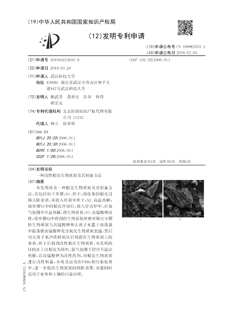 本发明涉及一种稻壳生物质炭及其制备方法,其包括如下步骤:S1.烘干:将收集的稻壳过筛去除杂质,并放入烘箱中烘干;S2.高温热解:将步骤S1中的稻壳冷却后,放入管式炉中,在氮气氛围中升温热解,得生物质炭;S3.高锰酸钾改性:将步骤S2中得到的生物质炭研磨并筛出小颗粒生物质炭与高锰酸钾和去离子水置于振荡器中震荡使高锰酸钾充分氧化生物质炭表面,然后用去离子水冲洗掉氧化后残留在生物质炭上的杂质,烘干后得到改性稻壳生物质炭。本发明的目的在于以稻壳为原料,氮气氛围下程序升温法热解,以高锰酸钾为改性药剂,对稻壳生物质炭进行改性制备,并将其应用在PAHs萘污染处理中,进一步提高生物质炭的吸附效果,并能同时适用于水体和土壤的污染治理。