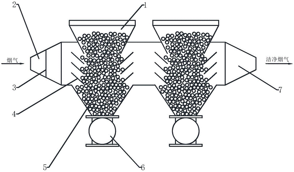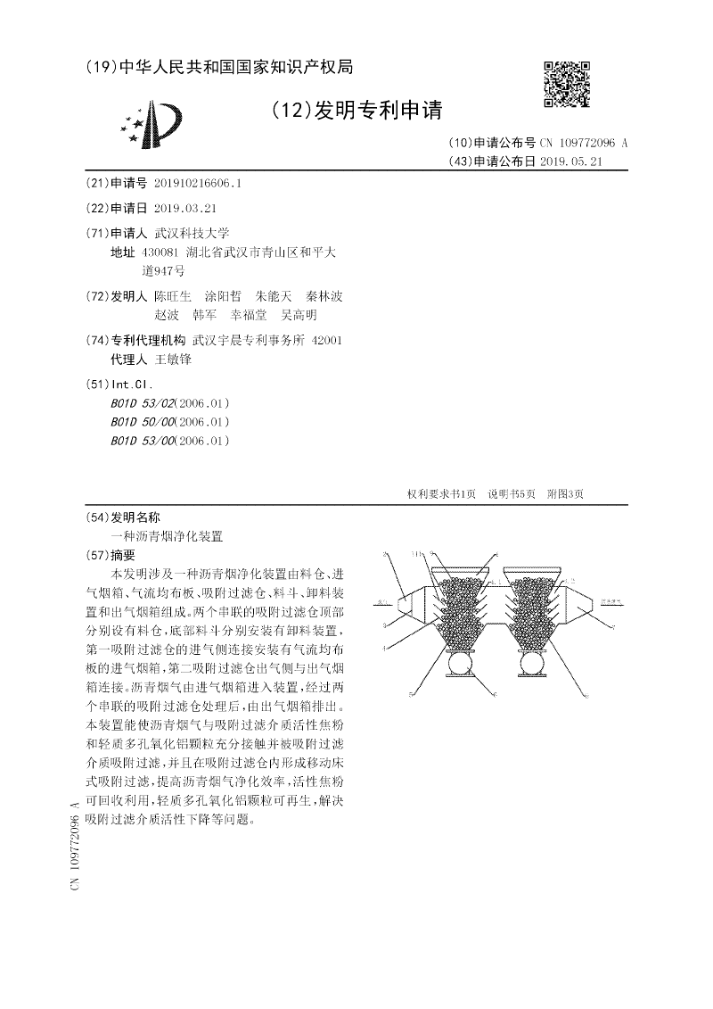 本实用新型涉及一种沥青烟净化装置由料仓、进气烟箱、气流均布板、吸附过滤仓、料斗、卸料装置和出气烟箱组成。两个串联的吸附过滤仓顶部分别设有料仓,底部料斗分别安装有卸料装置,第一吸附过滤仓的进气侧连接安装有气流均布板的进气烟箱,第二吸附过滤仓出气侧与出气烟箱连接。沥青烟气由进气烟箱进入装置,经过两个串联的吸附过滤仓处理后,由出气烟箱排出。本装置能使沥青烟气与吸附过滤介质活性焦粉和轻质多孔氧化铝颗粒充分接触并被吸附过滤介质吸附过滤,并且在吸附过滤仓内形成移动床式吸附过滤,提高沥青烟气净化效率,活性焦粉可回收利用,轻质多孔氧化铝颗粒可再生,解决吸附过滤介质活性下降等问题。