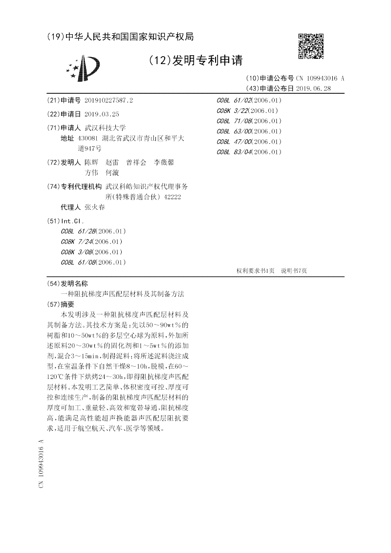 本发明涉及一种阻抗梯度声匹配层材料及其制备方法。其技术方案是:先以50~90wt%的树脂和10~50wt%的多层空心球为原料,外加所述原料20~30wt%的固化剂和1~5wt%的添加剂,混合3~15min,制得泥料;将所述泥料浇注成型,在室温条件下自然干燥8~10h,脱模,在60~120℃条件下烘烤24~30h,即得阻抗梯度声匹配层材料。本发明工艺简单、体积密度可控、厚度可控和连续生产,制备的阻抗梯度声匹配层材料的厚度可加工、重量轻、高效和宽带导通,阻抗梯度高,能满足高性能超声换能器声匹配层阻抗要求,适用于航空航天、汽车、医学等领域。