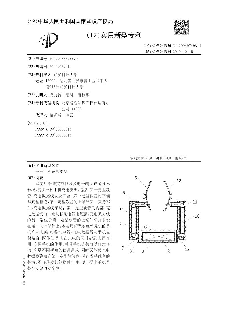 本实用新型实施例涉及电子辅助设备技术领域,提供一种手机充电支架,包括:第一定型软管、充电数据线以及底盒,第一定型软管的下端与底盒相连,第一定型软管的上端装第一夹持部件,充电数据线穿设在第一定型软管的内部,充电数据线的一端与移动电源电连接,充电数据线的另一端位于第一定型软管的上端外部并卡设在第一夹持部件上。本实用新型实施例提供的手机充电支架,将移动电源、充电数据线与手机支架结合,既能让手机在充电的同时起到支撑作用,方便手机的使用,并且手机支架可以任意转动,满足不同视角的使用需求;同时又能使充电数据线隐藏在第一定型软管内,从而保持线条的整洁,不容易被其他物件勾住,便于提高手机及整个支架的安全性。
