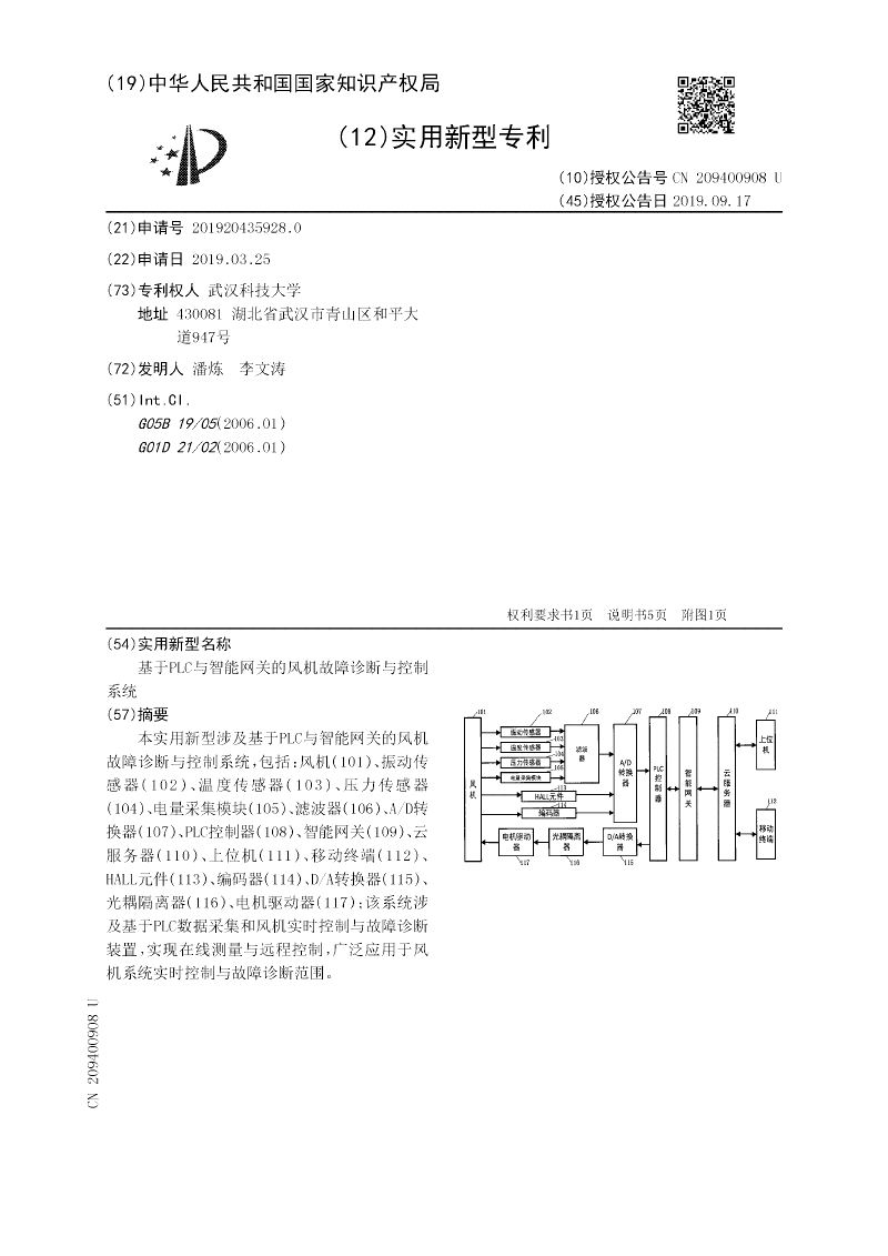 本实用新型涉及基于PLC与智能网关的风机故障诊断与控制系统,包括:风机(101)、振动传感器(102)、温度传感器(103)、压力传感器(104)、电量采集模块(105)、滤波器(106)、A/D转换器(107)、PLC控制器(108)、智能网关(109)、云服务器(110)、上位机(111)、移动终端(112)、HALL元件(113)、编码器(114)、D/A转换器(115)、光耦隔离器(116)、电机驱动器(117);该系统涉及基于PLC数据采集和风机实时控制与故障诊断装置,实现在线测量与远程控制,广泛应用于风机系统实时控制与故障诊断范围。