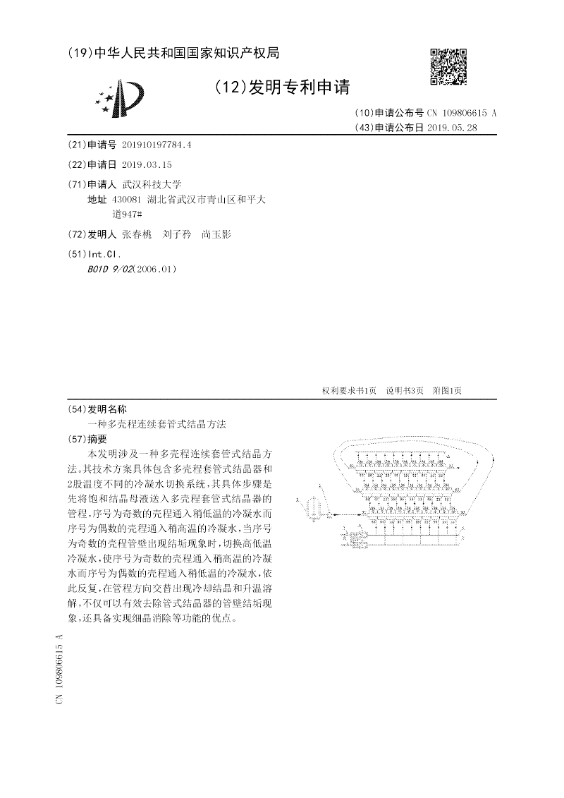 本发明涉及一种多壳程连续套管式结晶方法。其技术方案具体包含多壳程套管式结晶器和2股温度不同的冷凝水切换系统,其具体步骤是先将饱和结晶母液送入多壳程套管式结晶器的管程,序号为奇数的壳程通入稍低温的冷凝水而序号为偶数的壳程通入稍高温的冷凝水,当序号为奇数的壳程管壁出现结垢现象时,切换高低温冷凝水,使序号为奇数的壳程通入稍高温的冷凝水而序号为偶数的壳程通入稍低温的冷凝水,依此反复,在管程方向交替出现冷却结晶和升温溶解,不仅可以有效去除管式结晶器的管壁结垢现象,还具备实现细晶消除等功能的优点。