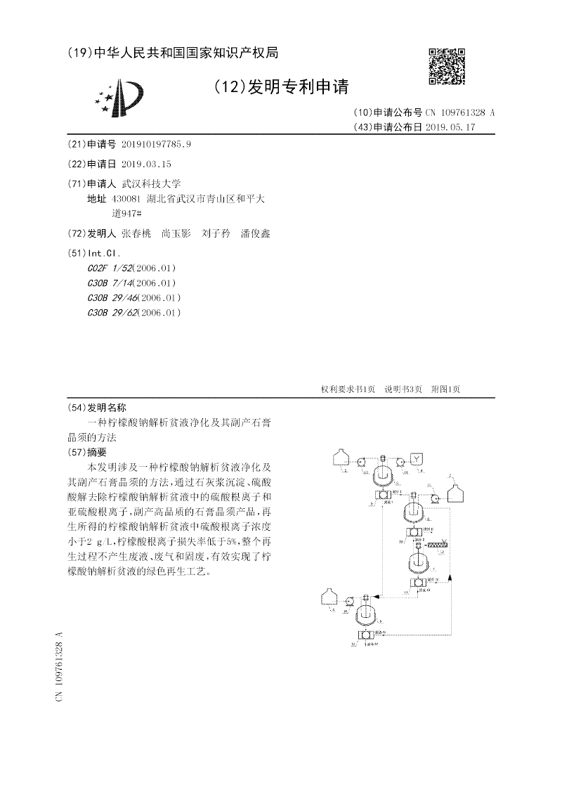 离子,并能最大限度保留柠檬酸根离子,而且能副产高品质的石膏晶须产品,具有降低生产成本、减少“三废”排放等优点。