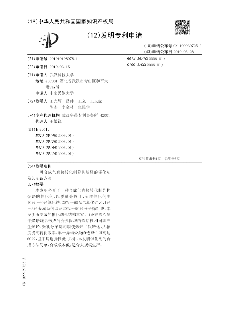 本发明公开了一种合成气直接转化制异构烷烃的催化剂,以质量分数计,所述催化剂由10%~60%氧化铁、20%~90%二氧化硅、0.1%~5%金属助剂以及20%~90%分子筛组成。本发明所制备的催化剂孔结构丰富,由正硅酸乙酯干燥焙烧后形成的介孔限域的铁活性相司职产生烯烃,微孔分子筛司职使烯烃二次转化,大幅度提高转化效率,单一异构烃类的选择性可高达60%,且甲烷选择性低;另外,本发明催化剂的合成方法简单,合成成本低,适合大规模生产。
