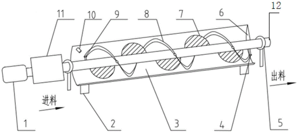 本实用新型涉及球团生产工艺用的圆筒混料机,包括:圆筒(3),固定设置,两端开口分别形成进料口和出料口;转轴(12),位于圆筒(3)内;多个搅拌叶片(7),固定在转轴(12)上;螺旋叶片(8),固定在转轴(12)上,且内径大于转轴(12)的直径;以及进水管(10),位于圆筒(12)上并靠近所述进料口。转轴转动带动螺旋叶片和搅拌叶片旋转,搅拌叶片搅拌混匀物料,而螺旋叶片推动物料的前进以及刮除圆筒内壁上堆积的厚料层。本实用新型的混料机能够使物料充分混匀并顺利排出,而且还能大大降圆筒混料机的功耗。