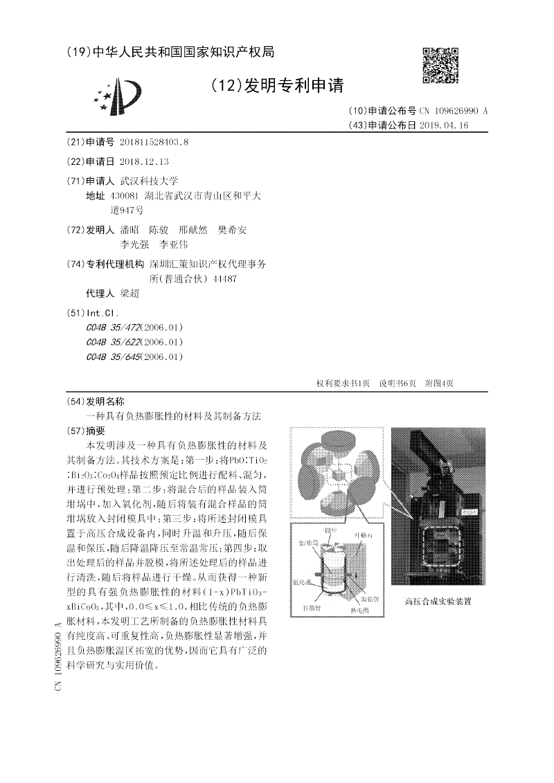 本发明涉及一种具有负热膨胀性的材料及其制备方法。其技术方案是:第一步:将PbO∶TiO