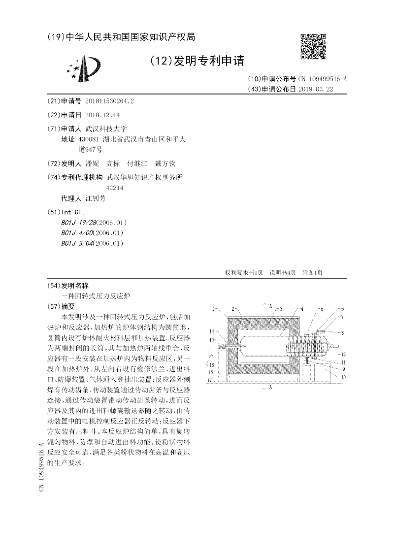 本发明涉及一种回转式压力反应炉,包括加热炉和反应器,加热炉的炉体钢结构为圆筒形,圆筒内设有炉体耐火材料层和加热装置。反应器为两端封闭的长筒,其与加热炉两轴线重合,反应器有一段安装在加热炉内为物料反应区,另一段在加热炉外,从左向右设有检修法兰、进出料口、防爆装置、气体通入和抽出装置;反应器外侧焊有传动齿条,传动装置通过传动齿条与反应器连接,通过传动装置带动传动齿条转动,进而反应器及其内的进出料螺旋输送器随之转动,由传动装置中的电机控制反应器正反转动;反应器下方安装有出料斗。本反应炉结构简单,具有旋转混匀物料、防爆和自动进出料功能,使粉状物料反应安全可靠,满足各类粉状物料在高温和高压的生产要求。
