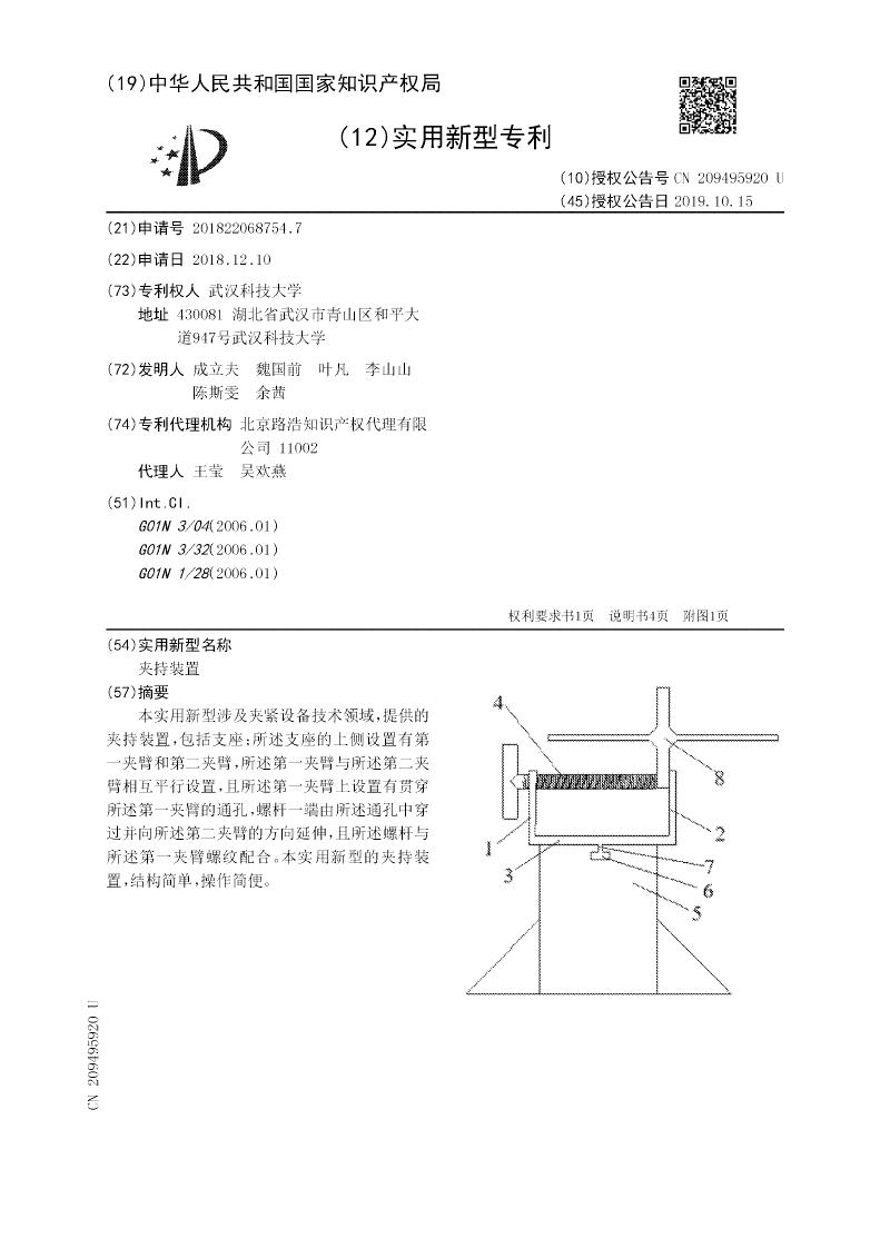 本实用新型涉及夹紧设备技术领域,提供的夹持装置,包括支座;所述支座的上侧设置有第一夹臂和第二夹臂,所述第一夹臂与所述第二夹臂相互平行设置,且所述第一夹臂上设置有贯穿所述第一夹臂的通孔,螺杆一端由所述通孔中穿过并向所述第二夹臂的方向延伸,且所述螺杆与所述第一夹臂螺纹配合。本实用新型的夹持装置,结构简单,操作简便。