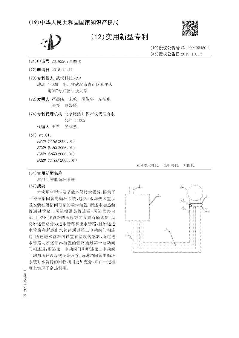 本实用新型涉及节能环保技术领域,提供了一种淋浴间智能循环系统,包括:水加热装置以及安装在淋浴间顶部的喷淋装置;所述水加热装置通过管路与所述喷淋装置连通;所述管路内部,且沿所述管路的长度方向设置有隔离层,以将所述管路分为进水管路和出水管路,且所述进水管路和所述出水管路通过第二电动阀门相连通;所述进水管路内设置有温度传感器,所述进水管路与所述喷淋装置的管路通过第一电动阀门相连通;所述第一电动阀门和所述第二电动阀门均与所述温度传感器连接。该淋浴间智能循环系统对水资源的回收利用更加充分,并在一定程度上实现了余热利用。