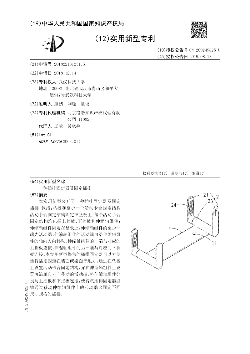 本实用新型公开了一种插排固定器及固定插排,包括:垫板和至少一个活动卡合固定结构活动卡合固定结构固定在垫板上;每个活动卡合固定结构均包括上挡板、下挡板和伸缩轴组件;伸缩轴组件固定在垫板上,伸缩轴组件的至少一端为活动端,伸缩轴组件的活动端可沿伸缩轴组件的轴向方向移动,伸缩轴组件的一端与对应的上挡板连接,伸缩轴组件的另一端与对应的下挡板连接。本实用新型提供的插排固定器可以方便地将插排固定在墙面或桌面等地方,通过在垫板上设置活动卡合固定结构,并在伸缩轴组件上设置可沿轴向方向移动的活动端,将伸缩轴组件分别与上挡板和下挡板连接,使得该插排固定器能够通过移动伸缩轴组件上的活动端来固定不同尺寸规格的插排。