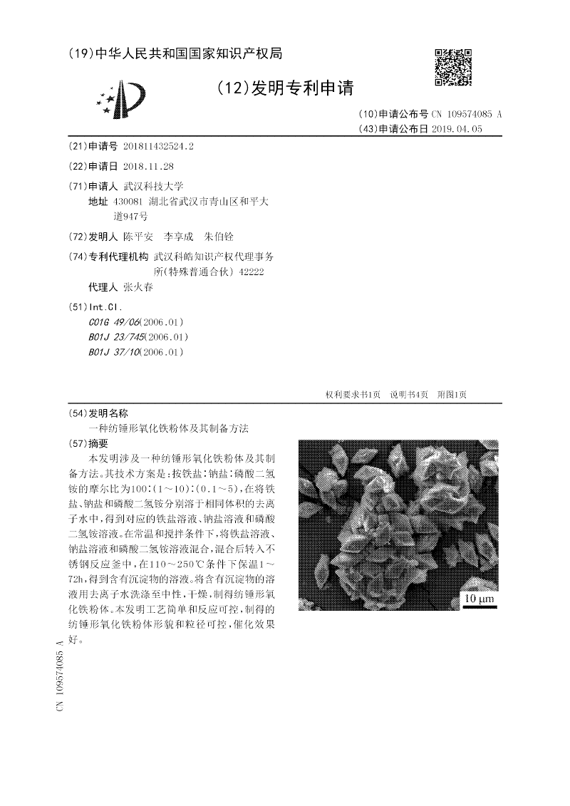 本发明涉及一种纺锤形氧化铁粉体及其制备方法。其技术方案是:按铁盐∶钠盐∶磷酸二氢铵的摩尔比为100∶(1~10)∶(0.1~5),在将铁盐、钠盐和磷酸二氢铵分别溶于相同体积的去离子水中,得到对应的铁盐溶液、钠盐溶液和磷酸二氢铵溶液。在常温和搅拌条件下,将铁盐溶液、钠盐溶液和磷酸二氢铵溶液混合,混合后转入不锈钢反应釜中,在110~250℃条件下保温1~72h,得到含有沉淀物的溶液。将含有沉淀物的溶液用去离子水洗涤至中性,干燥,制得纺锤形氧化铁粉体。本发明工艺简单和反应可控,制得的纺锤形氧化铁粉体形貌和粒径可控,催化效果好。