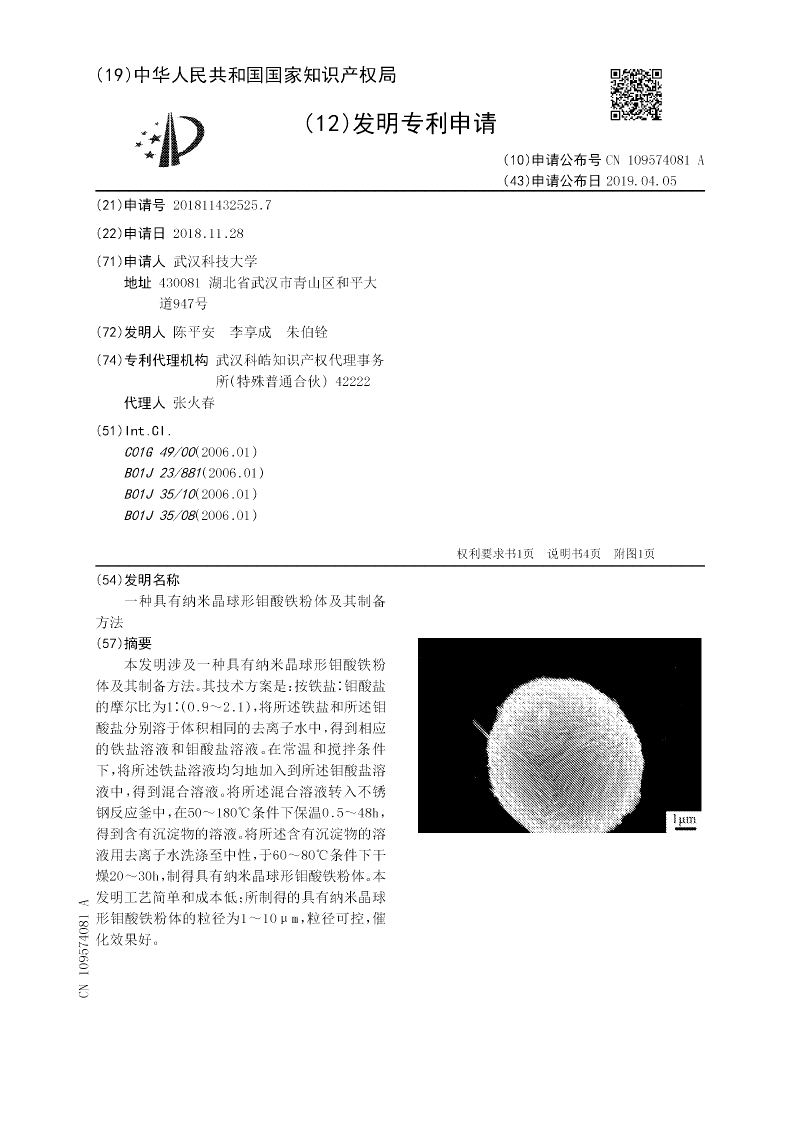 一种具有纳米晶球形钼酸铁粉体及其制备方法